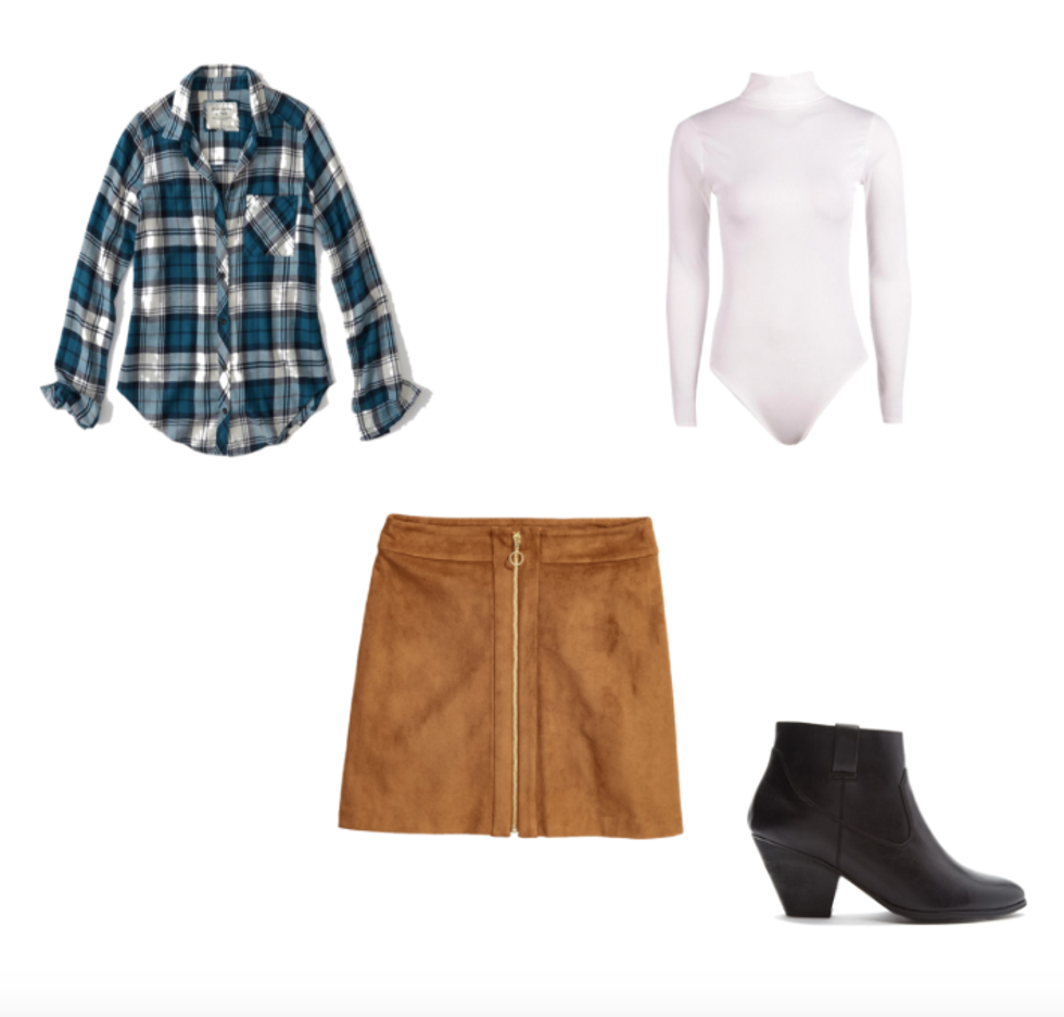 This outfit screams out Thanksgiving. Suede skirts are definitely in style for fall, and it'll make you look all festive, especially with a cute long sleeve bodysuit. Now, if you can't give up your flannel, then just incorporate it into this outfit (recommend tucking in the flannel into the skirt). And to finish this look just wear any cute black booties.