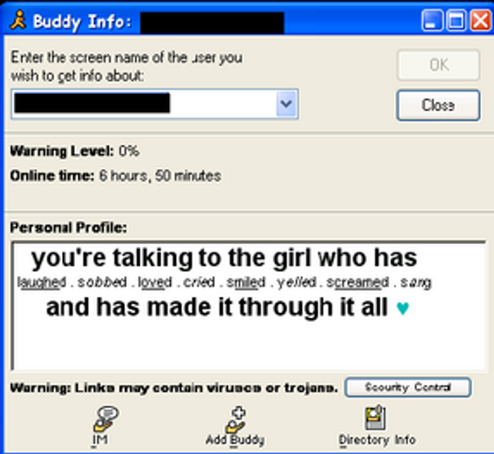 Remember when your screen name was a variation of "xoQTpie101xo?" Or when you would let everyone know who you were friends with by listing all of their initials in your AIM profile? And, if you had time, you would write out individual shout-outs to them, complete with inside jokes and emoticons. Remember when this was your away message: "homework.dinner.basketball game. ~LeAvE oNe~"? There was also that one time we used our "Buddy Profiles" to showcase really dramatic quotes about life and love, because we were convinced that we knew everything about emotions in junior high.