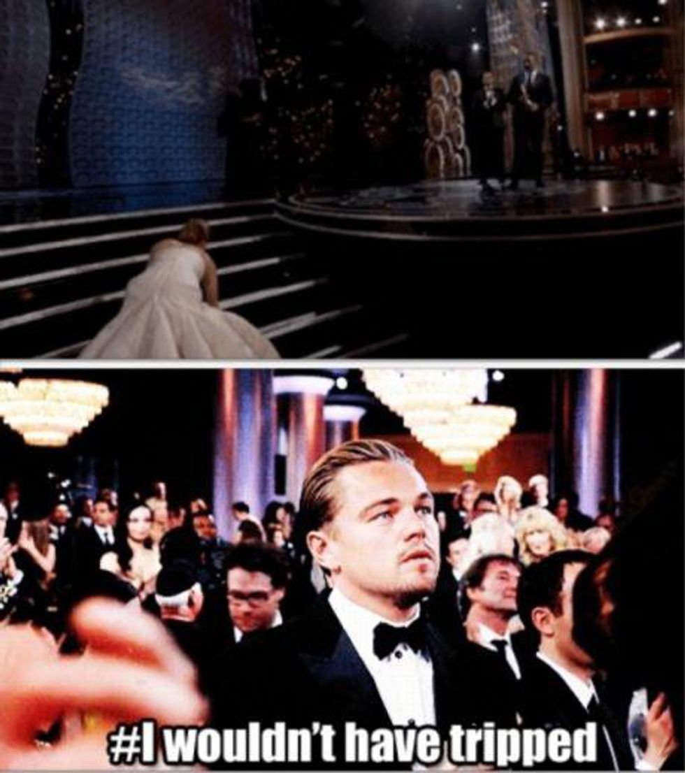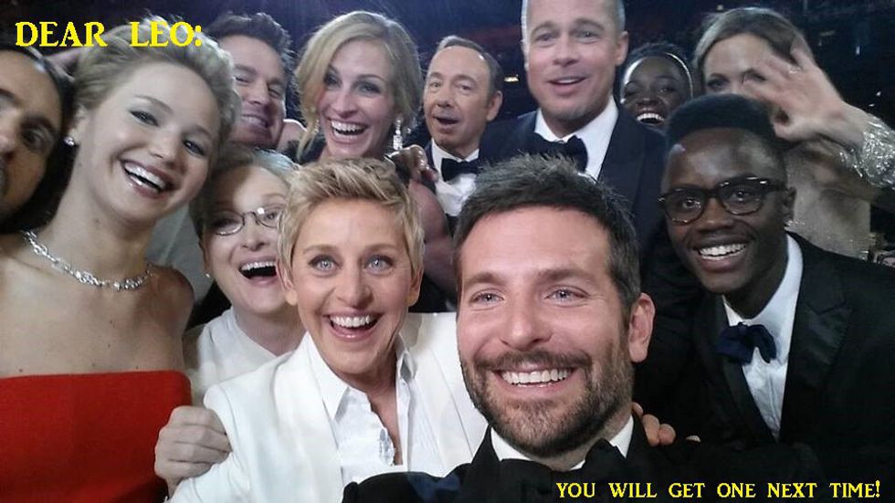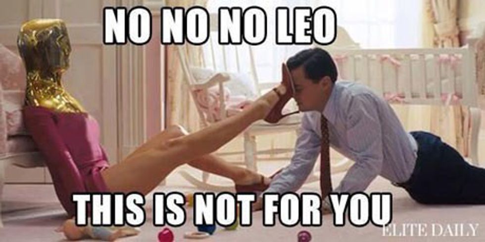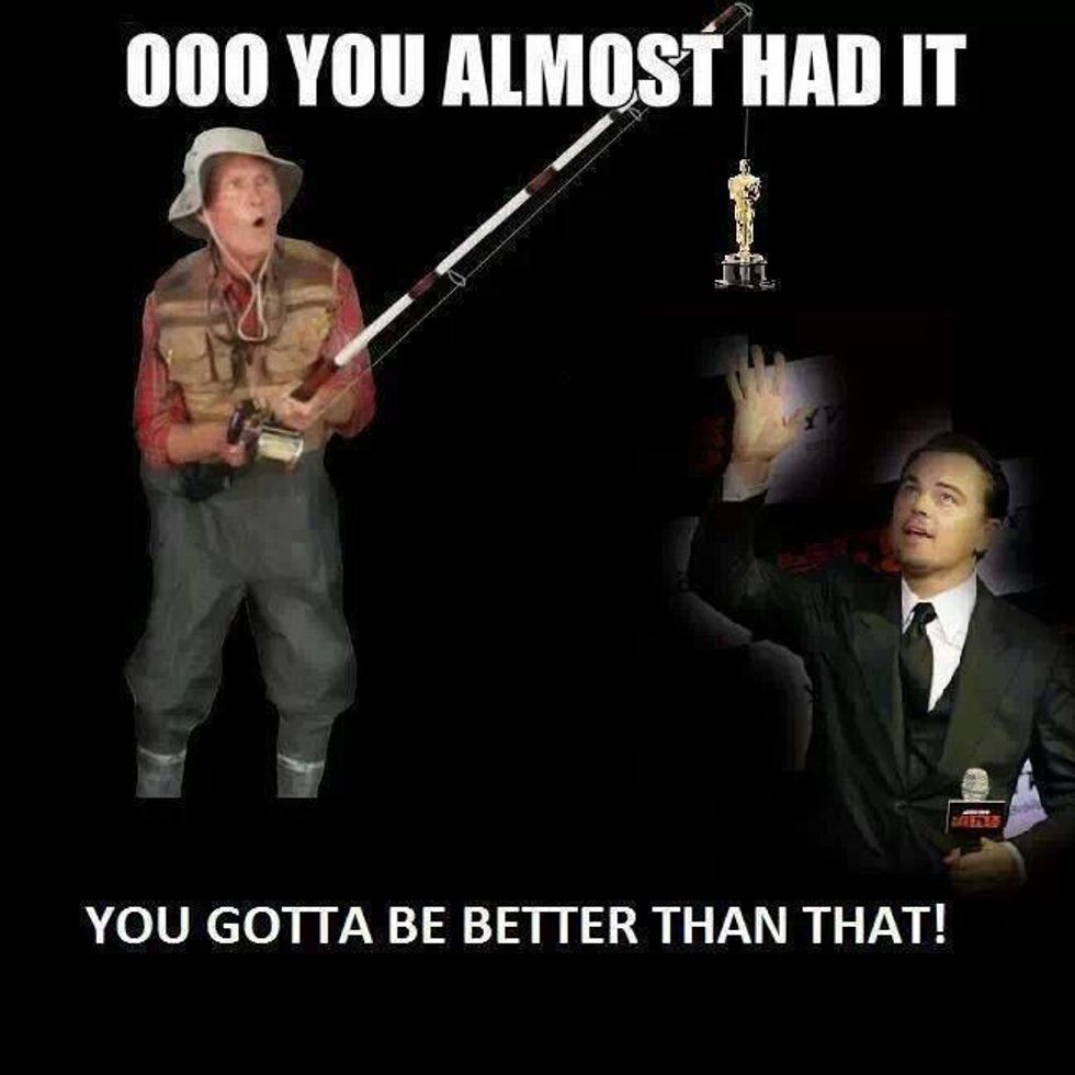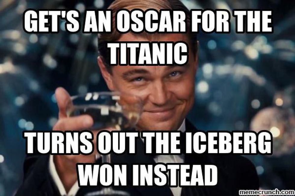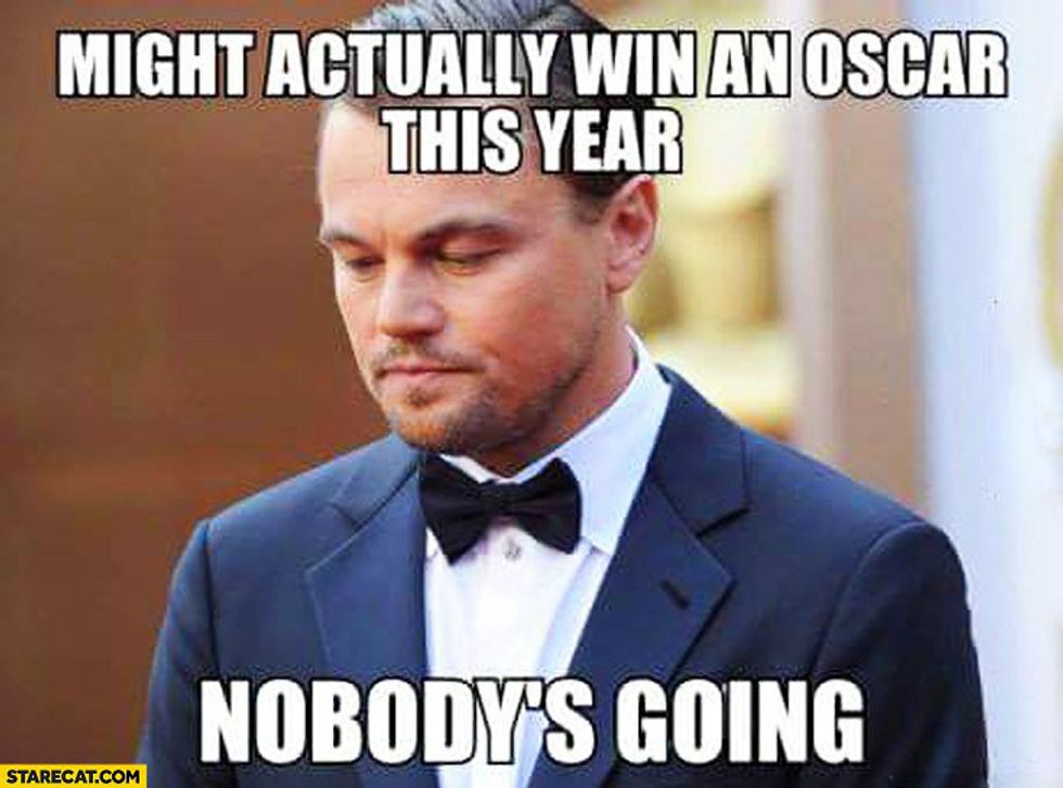 Throughout his acting career, Leonardo DiCaprio has received six Academy Award nominations. This year, he received his sixth Academy Award nomination for his stellar performance in the film, "The Revenant." It is no secret that DiCaprio is an amazing actor, which is why many of his fans and colleagues wonder why he has been so unlucky at the Academy Awards. I mean, seriously! Just take a look at the following movie titles that, before this year, he was nominated for the "Best Actor In A Leading Role" category: "The Aviator" (2004), "Blood Diamond" (2006), and "The Wolf Of Wall Street" (2013). Leo has also received a nomination for the "Best Actor In A Supporting Role" category for his performance in the film, "What's Eating Gilbert Grape" (1994); and, as a producer, he received a second nomination for his film, "The Wolf Of Wall Street," for the "Best Motion Picture Of The Year" category. Although DiCaprio has been unsuccessful at the Academy Awards thus far, hopefully this is Leo's year to shine. This year, DiCaprio's competition for the "Best Actor In A Leading Role" category are: Bryan Cranston ("Trumbo"), Michael Fassbender ("Steve Jobs"), Eddie Redmayne ("The Danish Girl"), and Matt Damon ("The Martian"). Although each of these nominated actors had stellar performances in their respective films (I mean, that's why they were nominated in the first place, right?), DiCaprio's performance in "The Revenant" is definitely amazing enough to get him his first "W" at the 88th Academy Awards ceremony on February 28th, 2016. Whether he wins or loses, however, you can count on the internet exploding with memes and gifs that either depict how elated DiCaprio is to win his first Oscar, or how devastated he is to lose for the sixth time in his acting career. Until then, here are 31 hilarious Oscar-themed Leonardo DiCaprio memes (which includes one gif):