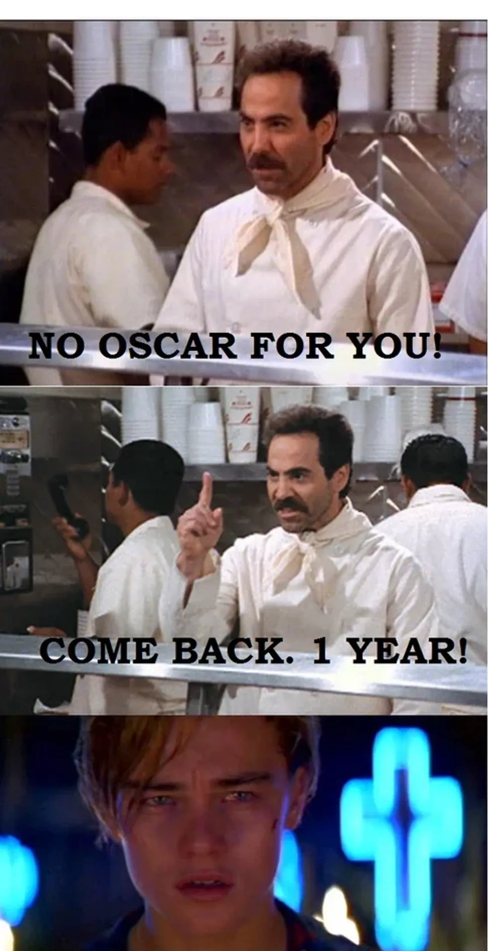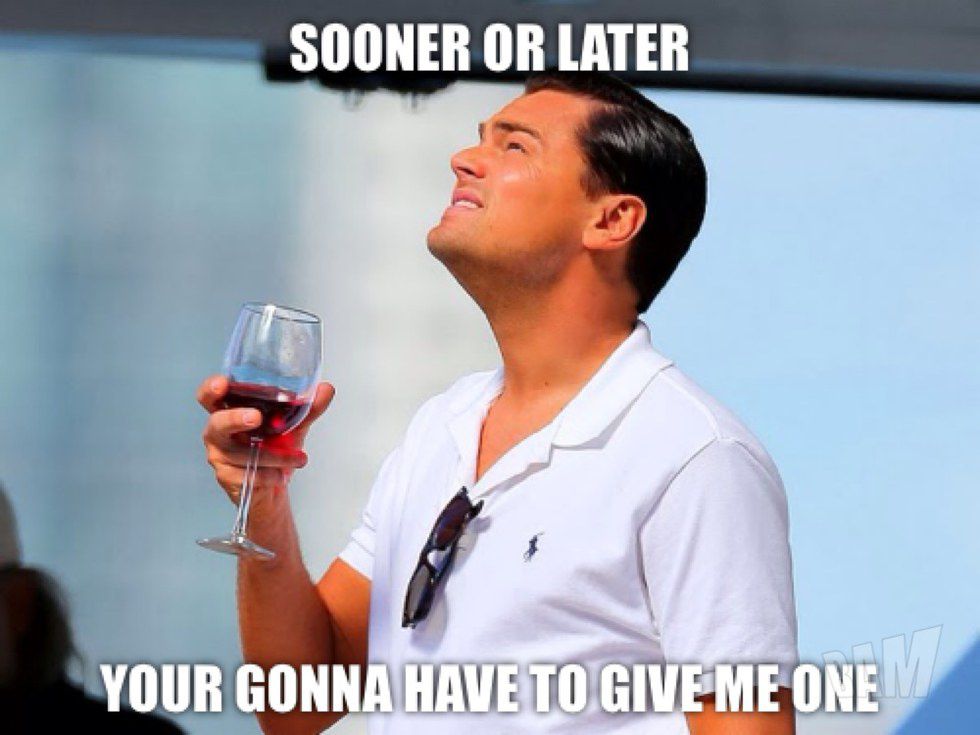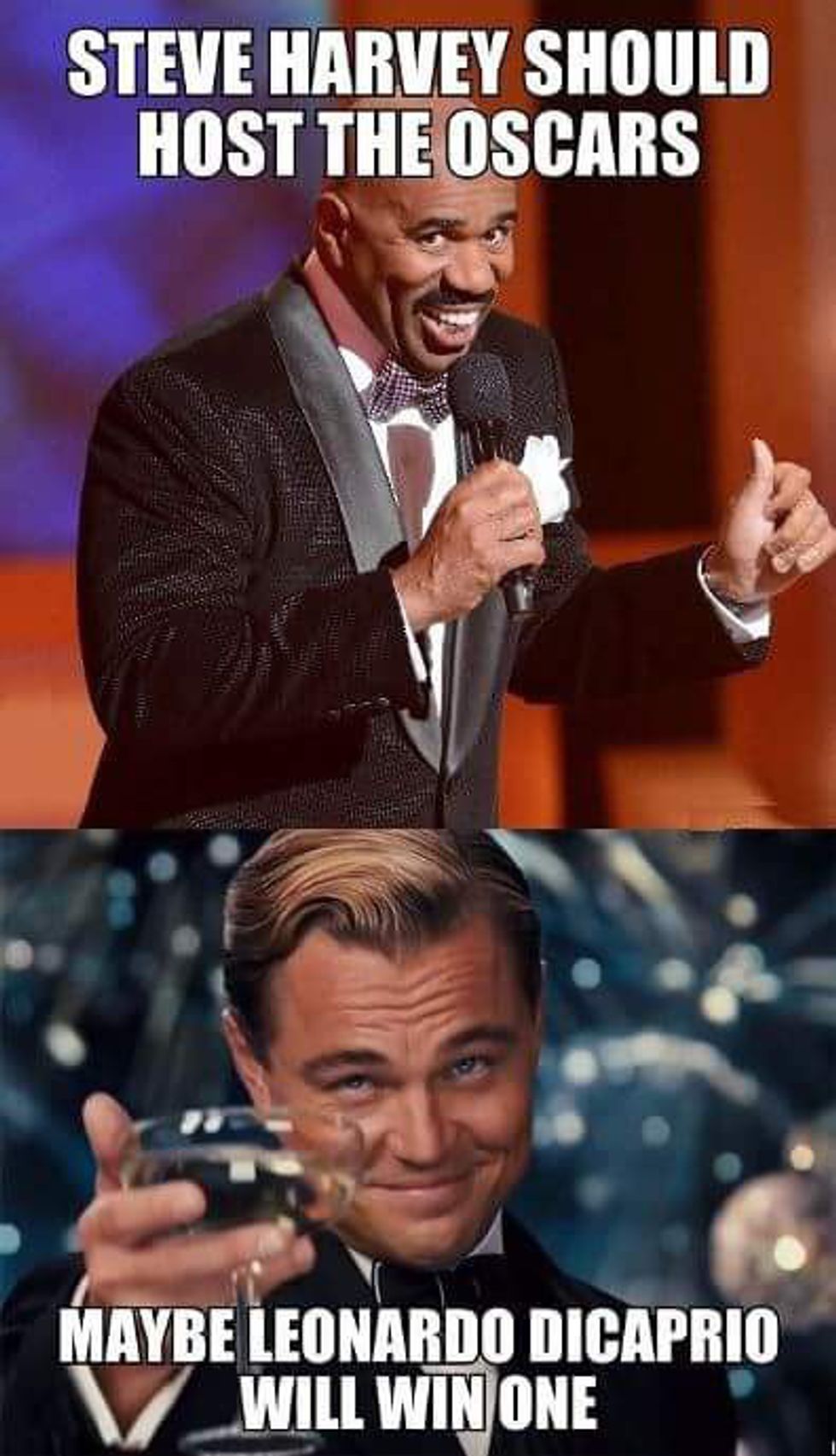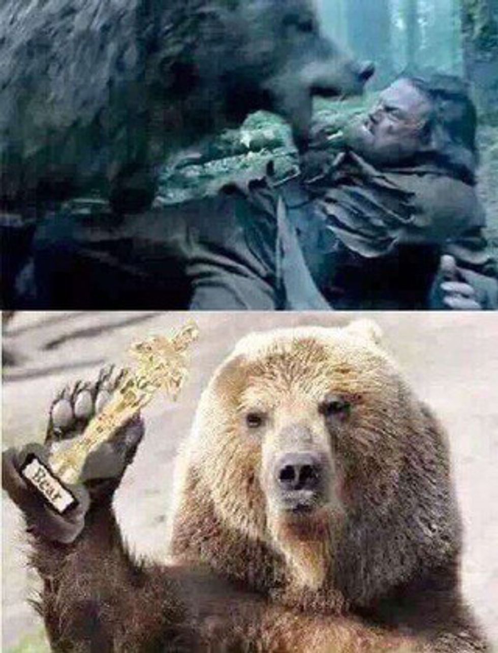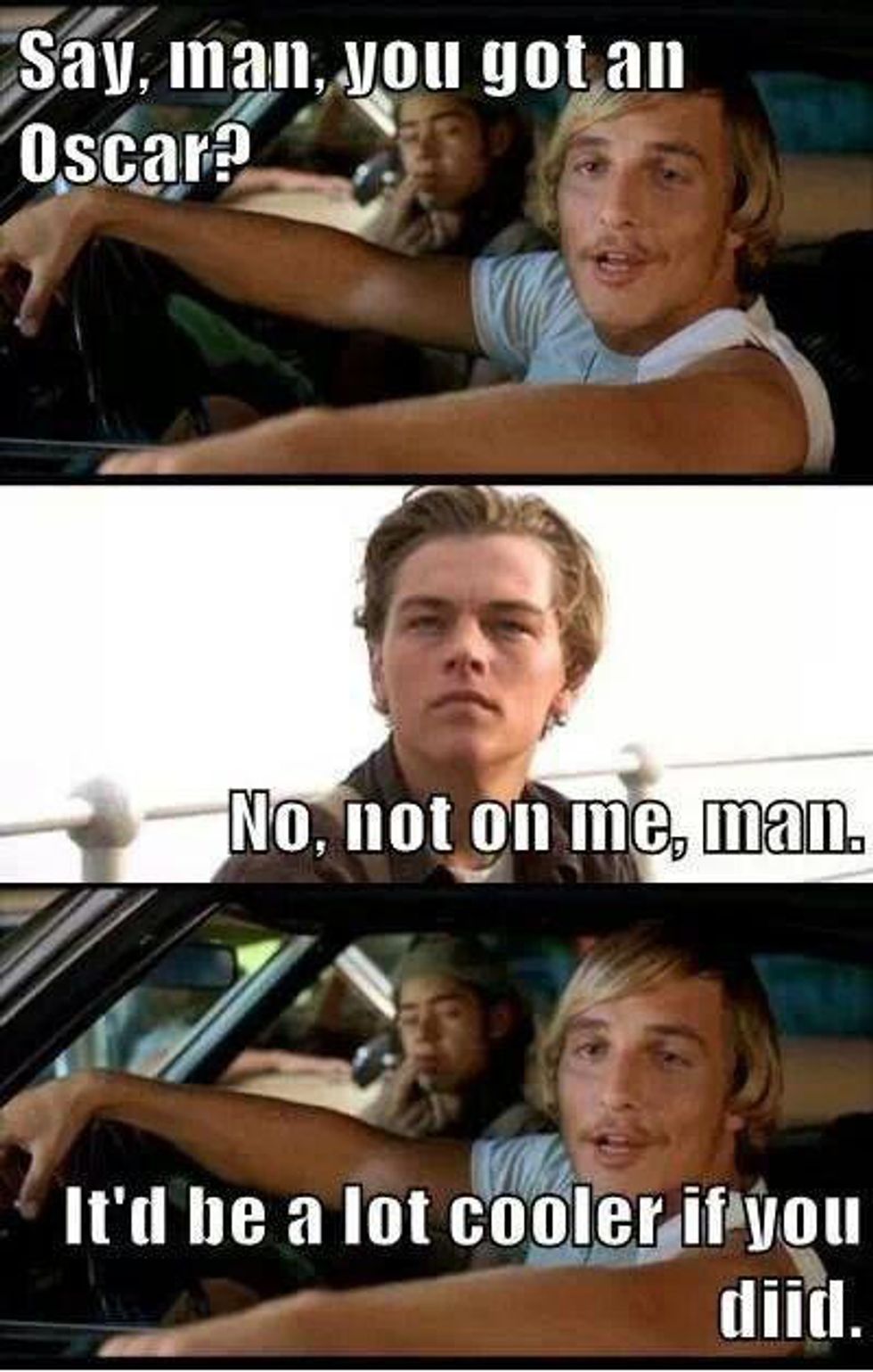 Throughout his acting career, Leonardo DiCaprio has received six Academy Award nominations. This year, he received his sixth Academy Award nomination for his stellar performance in the film, "The Revenant." It is no secret that DiCaprio is an amazing actor, which is why many of his fans and colleagues wonder why he has been so unlucky at the Academy Awards. I mean, seriously! Just take a look at the following movie titles that, before this year, he was nominated for the "Best Actor In A Leading Role" category: "The Aviator" (2004), "Blood Diamond" (2006), and "The Wolf Of Wall Street" (2013). Leo has also received a nomination for the "Best Actor In A Supporting Role" category for his performance in the film, "What's Eating Gilbert Grape" (1994); and, as a producer, he received a second nomination for his film, "The Wolf Of Wall Street," for the "Best Motion Picture Of The Year" category. Although DiCaprio has been unsuccessful at the Academy Awards thus far, hopefully this is Leo's year to shine. This year, DiCaprio's competition for the "Best Actor In A Leading Role" category are: Bryan Cranston ("Trumbo"), Michael Fassbender ("Steve Jobs"), Eddie Redmayne ("The Danish Girl"), and Matt Damon ("The Martian"). Although each of these nominated actors had stellar performances in their respective films (I mean, that's why they were nominated in the first place, right?), DiCaprio's performance in "The Revenant" is definitely amazing enough to get him his first "W" at the 88th Academy Awards ceremony on February 28th, 2016. Whether he wins or loses, however, you can count on the internet exploding with memes and gifs that either depict how elated DiCaprio is to win his first Oscar, or how devastated he is to lose for the sixth time in his acting career. Until then, here are 31 hilarious Oscar-themed Leonardo DiCaprio memes (which includes one gif):