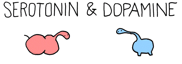 Serotonin is a neurotransmitter that helps regulate mood, impulse, and memory. Dopamine is a neurotransmitter that's associated with the pleasure center of the brain, meaning it deals with emotions and motivation. They are both important in your brain in order to be at neutral levels. If you'd like to know about it more, here's a video that explains them. (In other words, they are your happy.)