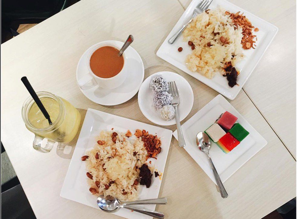 This is a Peranakan breakfast that includes lemon tea, Thai milk tea, Nyonya Kuehs , ondeh-ondeh, and sticky rice. [I sincerely apologize if I mislabeled any of these]