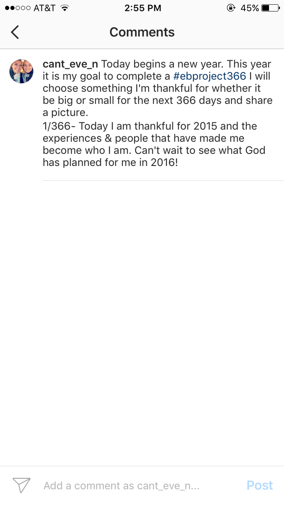Another huge event that happened to me as a result of a small decision I decided to make on January 1st, 2016. While making this little decision, I had no idea the impact that this would result in my life. This decision was to start an "#ebproject366" During this project, I would post on instagram an event, a person, a quote, a memory, etc that I was thankful for that day.