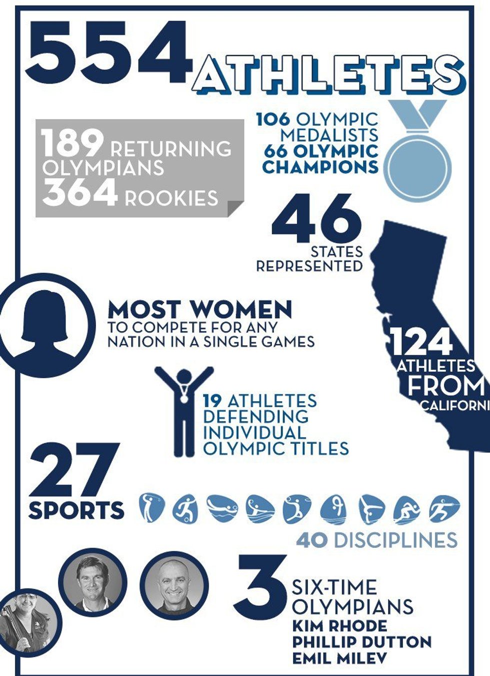 20. There are three six-time Olympians -- Phillip Dutton, Emil Milev and Kim Rhode.