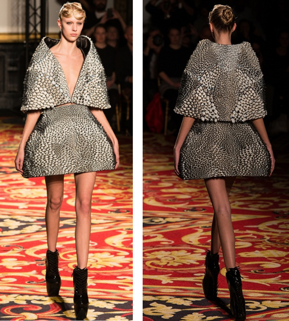 Iris van Herpen actually developed her own textile, TPU 92A-1. TedxAmsterdam says this material is "the first printable material that is flexible, durable enough to be worn – and to be put in the washing machine."In 2013, Iris van Herpen had an 11-piece collection which had two 3D-printed looks. This look above was one of them. According to Materialise.com, "The 3D-printed skirt and cape were produced using Stratasys’ unique Objet Connex multi-material 3D printing technology, which allows a variety of material properties to be printed in a single build. This allowed both hard and soft materials to be incorporated within the design, crucial to the movement and texture of the piece."