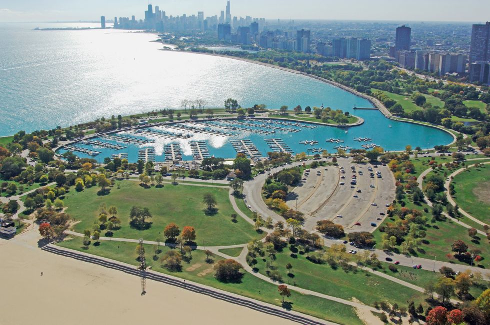 Just north of the peace garden is the harbor which is full of boats, socially distant benches, and birdhouses as it is right next to the bird sanctuary. This harbor has an amazing view of the skyline and is a perfect place to hang out on a summer day.