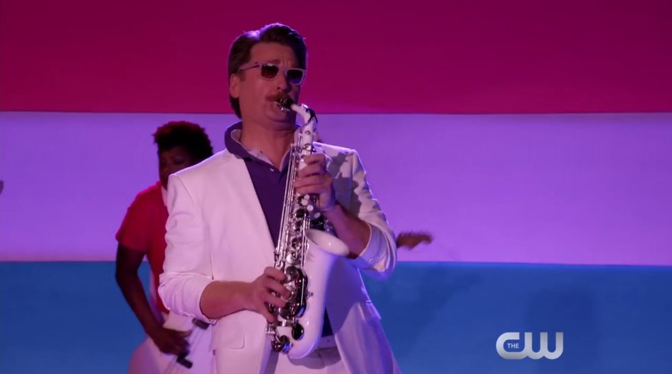 Darryl is the head of the law firm that the main character works for and he is sweet, awkward, and just really wants to be everyone's friend. In the beginning of the series he is going through a divorce with his wife and then later discovers that he has feelings for a man. He comes to the realization that he is "bothsexual" and then sings a song about his bisexuality called "Gettin' Bi." In his coming out song he plays the sax in front of the bisexual pride flag and debunks some misconceptions about bisexuality with lyrics such as, "Being bi does not imply that you're a player or a slut."