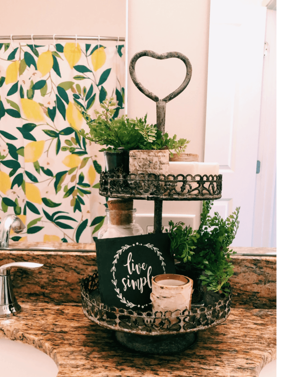 I got this idea off of Pinterest and I am so in love with it! There are tons of ways to make your storage aesthetically pleasing. This two tier tower sits on my bathroom counter and holds candles, (more) artificial plants, a jar of cotton balls/Q-tips, and bars of soap! I could fit more on here, but I prefer a more minimalistic look. In the background you can see my lemon patterned shower curtain. Bright and pattered shower curtains are a beautiful way of adding pops of color to your bathroom!
