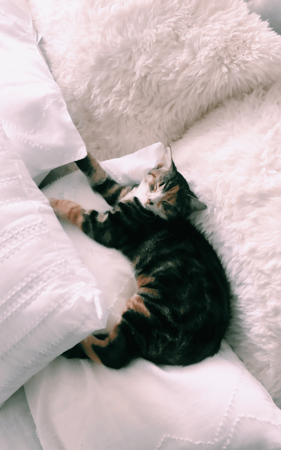 Throw pillows and shams come in all different sizes, colors, textures, and designs. I got these 2 fluffy white throw pillows (which Stella loves) from Nordstrom Rack and they add a comfortable look and feel to my bed. I also added a few smaller throw pillows for a more pleasing look.
