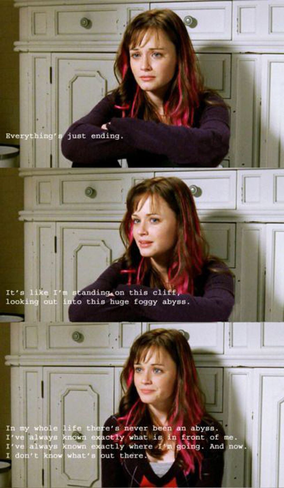 Rory was told she did not have what it took to be a reporter- the dream she had all of her life. When she felt like she had no other choice, like she had all her dreams crushed, she took time off of school. During this time she lived with her grandparents because her mom was furious with her for not going to school and she worked for the Daughters of American Revolution. She had to figure out what she was doing so she kind of had to do a detour with her life. Not knowing what you want in your life at every point of it is okay. When you just can not handle everything going on and just need to take a step back and think is this really for me.