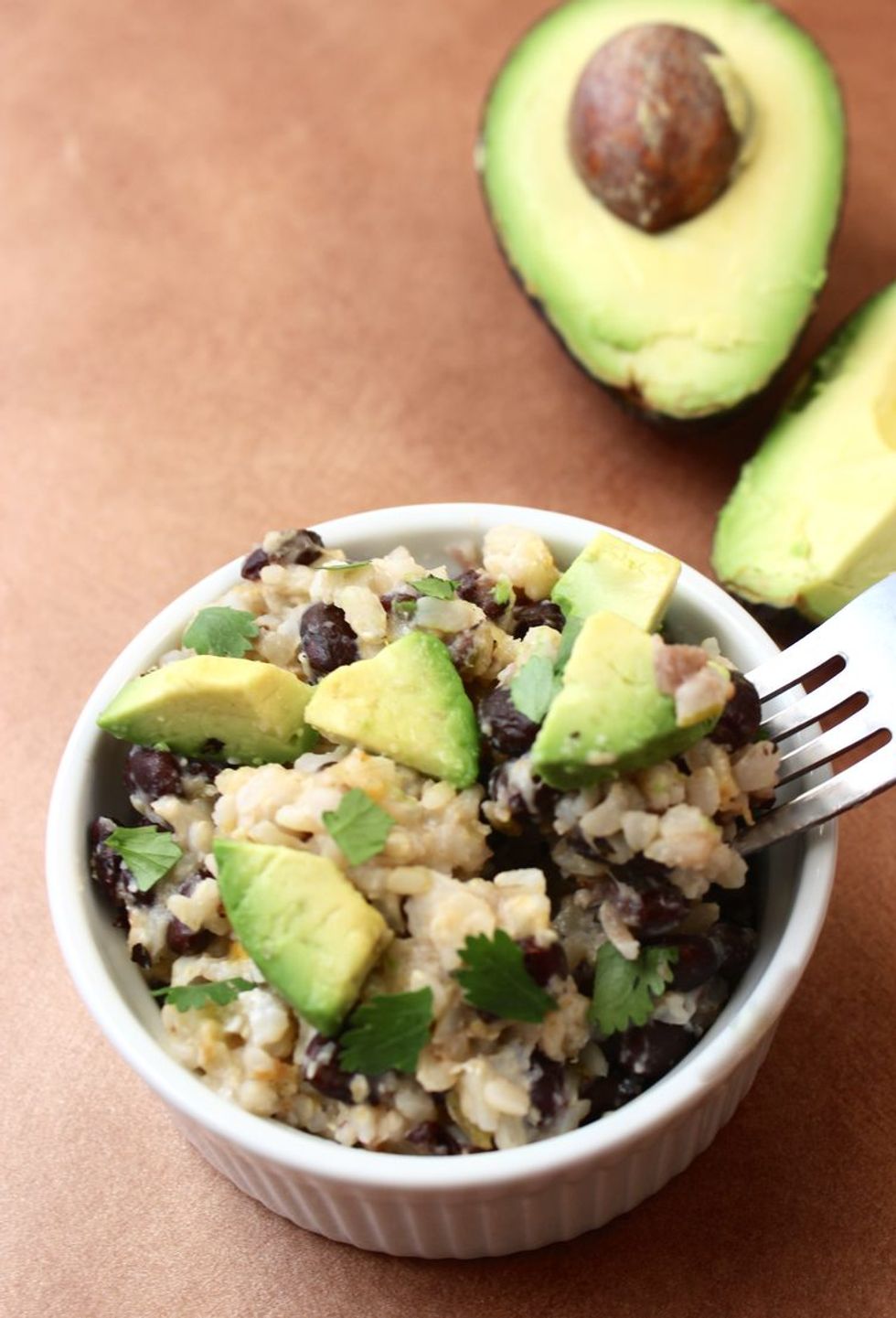 Throw some black beans, instant rice, hot water, avocado, cilantro, Greek yogurt and salsa into the microwave, and you've got a quick and easy dinner.