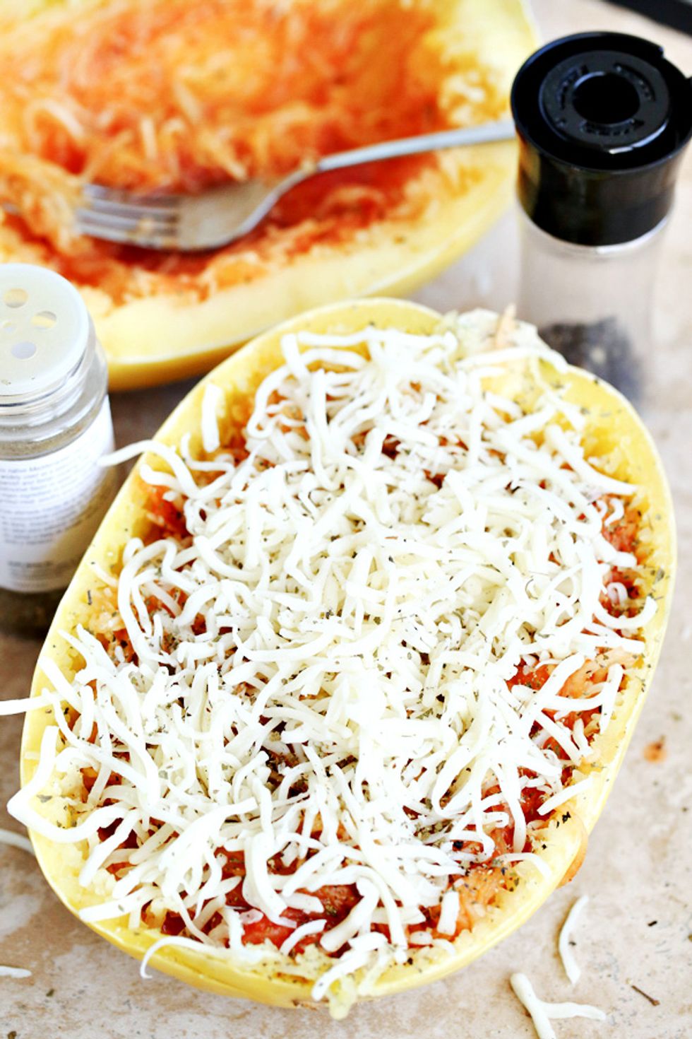 Cut the spaghetti squash in half and take out the seeds. Then put both halves in the microwave for 10 minutes. Use a fork to separate the strands. Now just add tomato sauce and cheese!