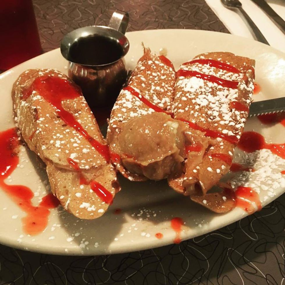 Stuffed French Toast - Vanilla vegan cream cheese, topped with caramelized banana butter, strawberry sauce, maple syrup, and powdered sugar