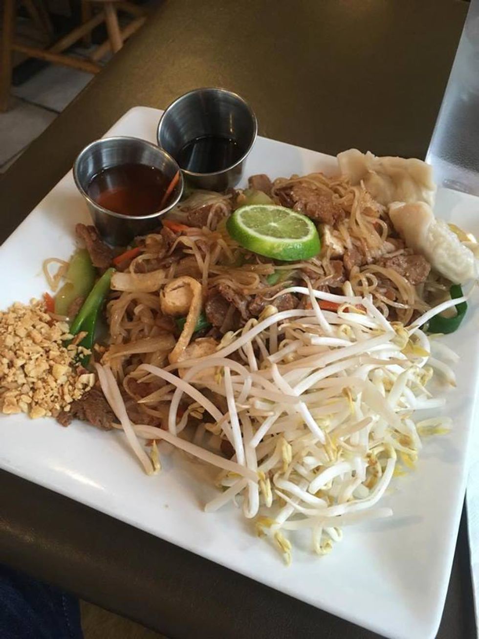 Vietnamese Noodle Dish - Veggie beef and tofu stir-fried with vegetables and rice noodles with fresh bean sprouts and steamed dumplings