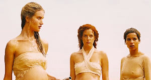 I do not know when I last saw a movie that had old women who fought in a battle. In Mad Max, the main characters come across a group of women called the Vulvani who now roam the desert on motorcycles looking for fertile soil in which to plant seeds from their old home. Except for one woman in the group, they are all old. The director, George Miller portrays them in all their wrinkled glory. The Vulvani welcome Furiosa and her female refugees, which makes for some very touching scenes of multi-generational female friendship. The groups bond together and with their shared community and courage, plan to start a new life together. These women gallantly defend each other with fist, rifle and life and genuinely desire the best – knowing each has fallen on hard times. The wives seek a land where they can live as women and not as things. The Vulvani are looking for a place to settle and grow new life: each wishes to flourish.