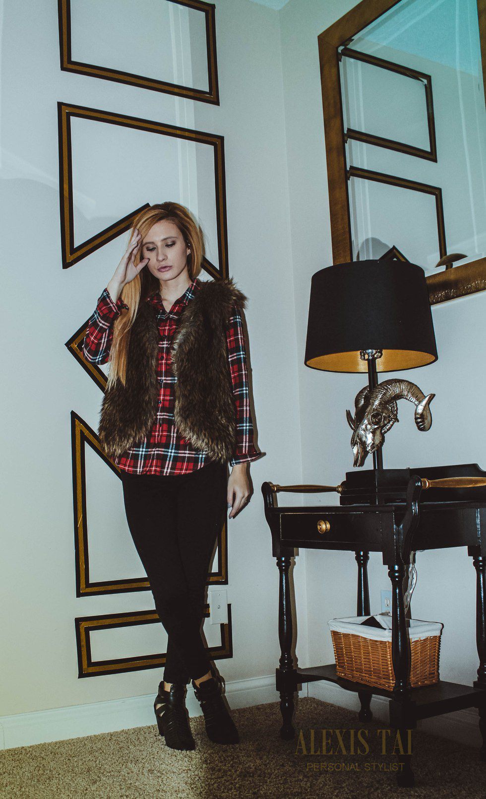 For look number one above, I buttoned my red plaid shirt until the last button to the collar to give it a more relaxed look. I then added a faux fur vest to add texture and chicness not to mention some warmth. I paired this combo with black jeans and some black booties. You can so pair this with jeans and some hunter boots or tall brown or black riding boots. Just remember if you wear jeans and tall boots make sure your jeans are either skinny or straight! It's a nightmare trying to put boot-cut jeans into tall boots and the end result doesn't look chic at all.