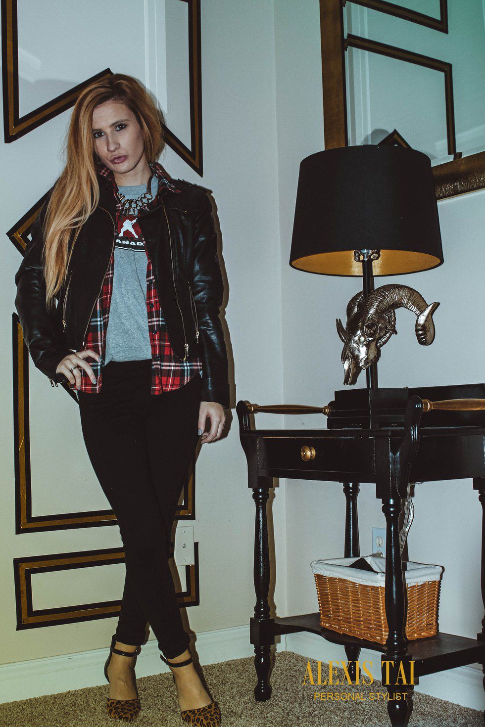 For look number two, this is more of a sporty chic babe look as I like to call it. I first started with a gray graphic tee and tucked that in a little bit into my jeans. Mine is a Canada hockey shirt ( if you know me personally, this doesn't surprise you) This is a way to put your personality into your outfit. Next I put my plaid shirt unbuttoned over top of my tee and then layered that once more with a black leather jacket. Simple black jeans and a neutral toned necklace. For shoes, I went a little bold and wore cheetah print heels to match my personality and to add a little dimension to the outfit. If you don't wear heels, you can simply pair this with some converse, Nikes, or some flat ankle booties.