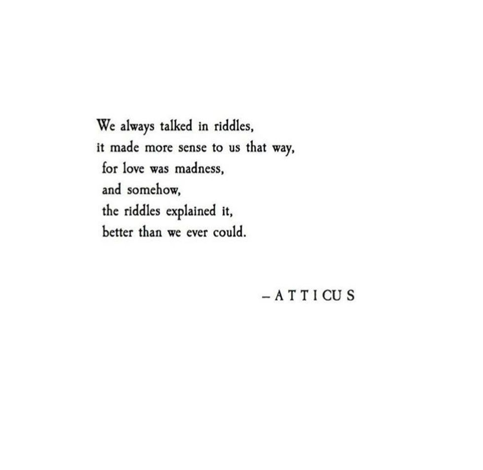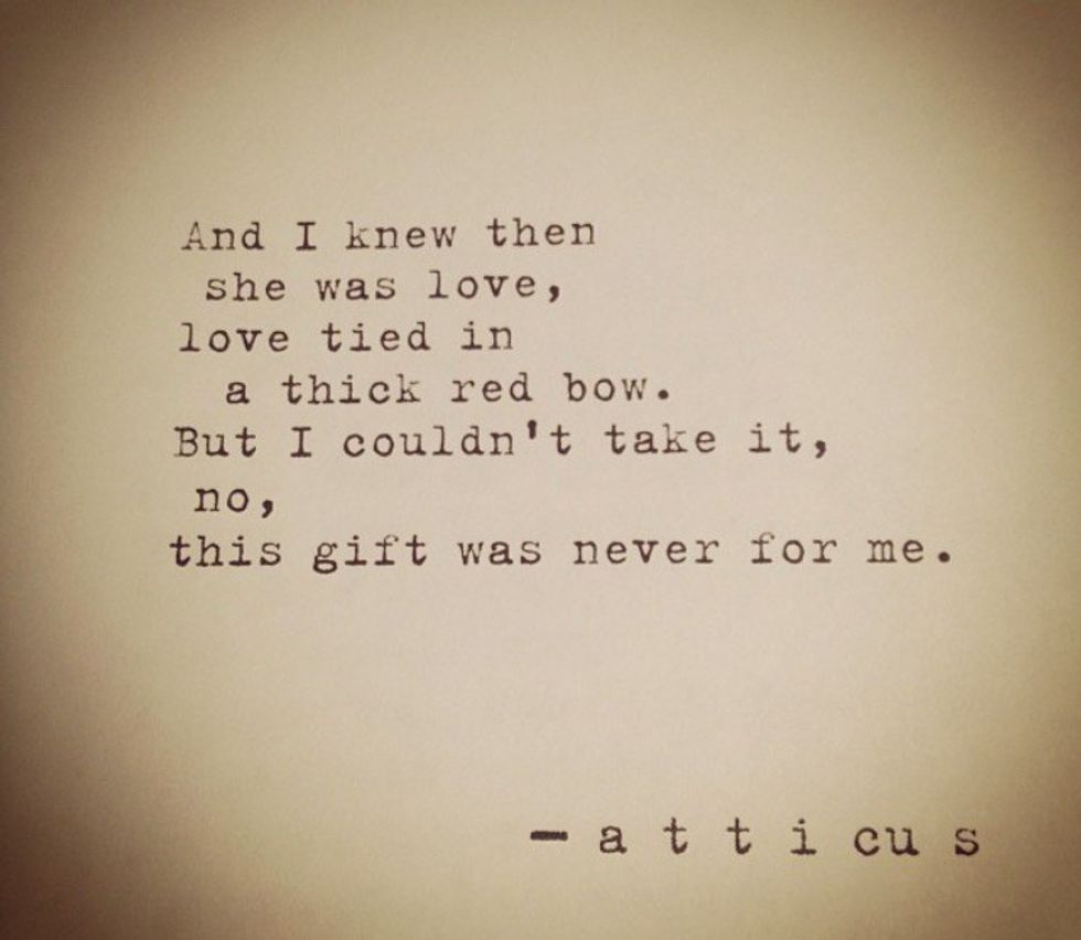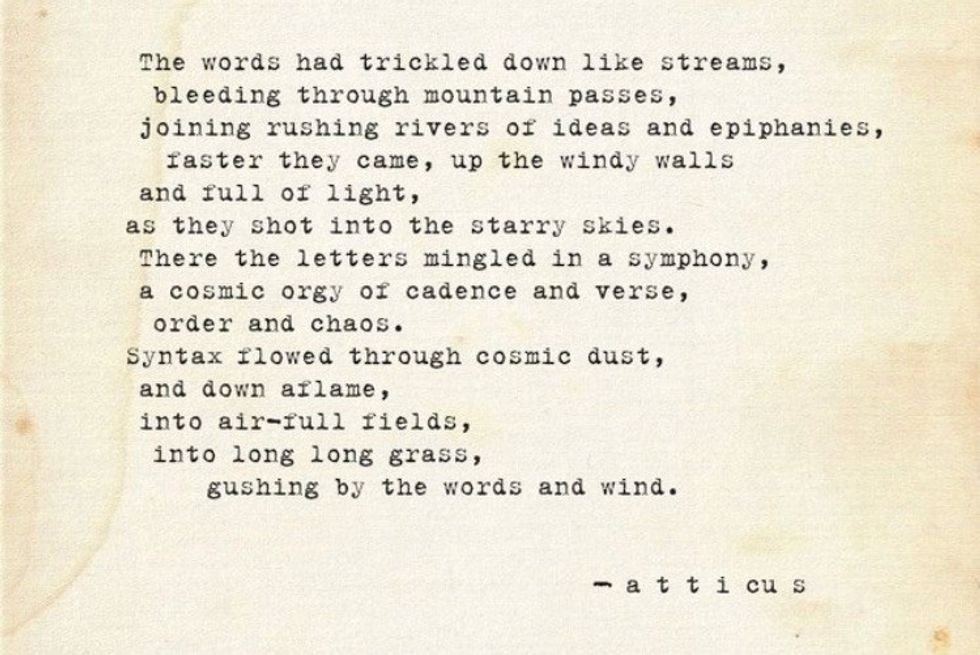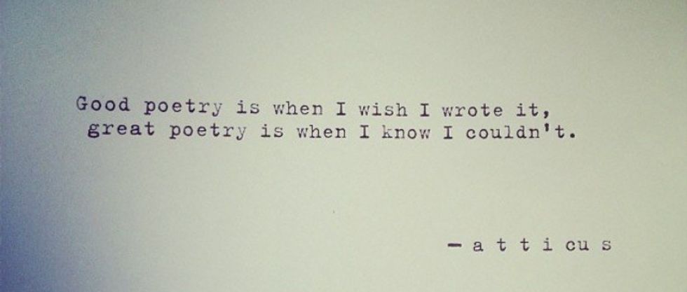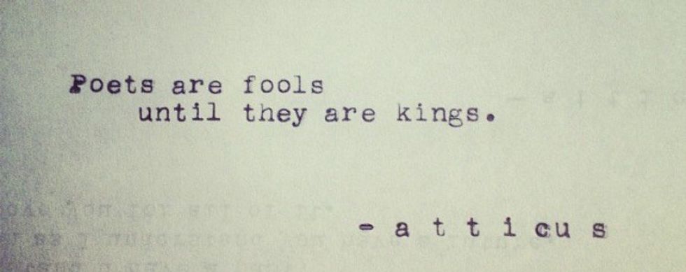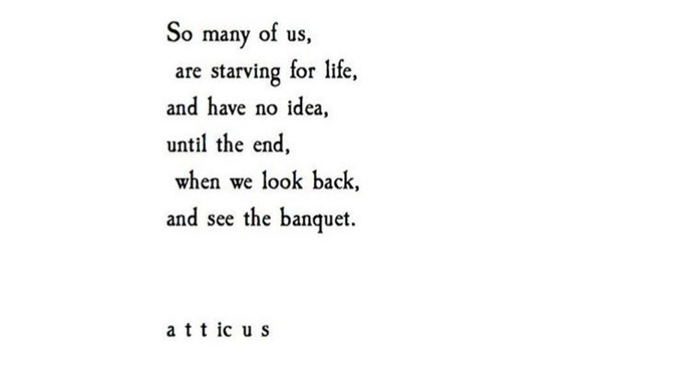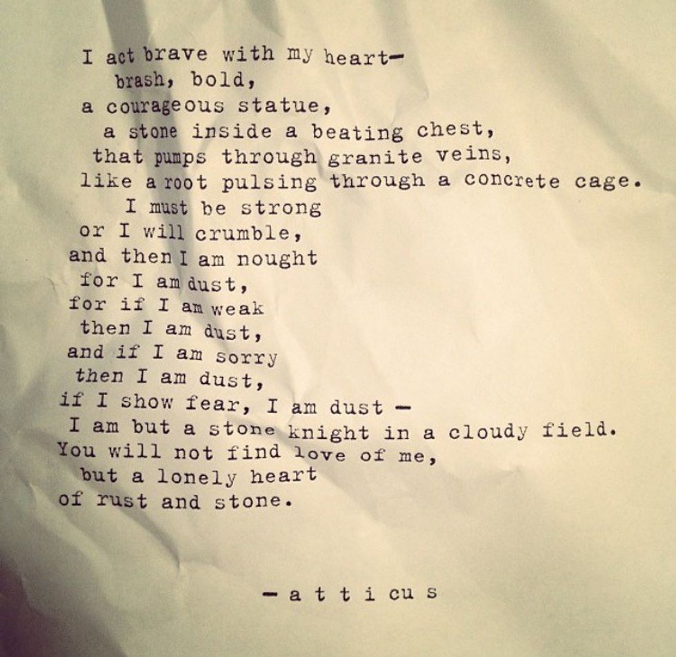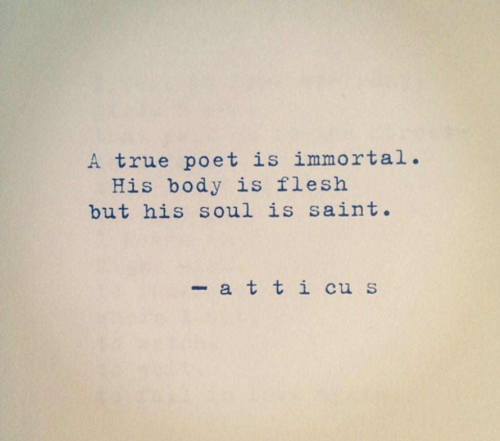 Atticus , a mysterious poet found primarily on social media, has a way of taking his/her followers along for a ride on an emotional rollercoaster. In just a few words, most of which are written in typewriter font in front of a plain white background, we feel the pain, love, and curiosity he/she is feeling. Atticus' work is enough to make your soul feel alive or at least it is for me. It has been shared and followed by over 100 thousand people including Karlie Kloss and the Kardashians. Atticus' poetry has a way of making us feel alive, alone, broken hearted and in love. And though no one really knows who the author truly is, isn't this the point of writing, to make your readers' emotions come to life?