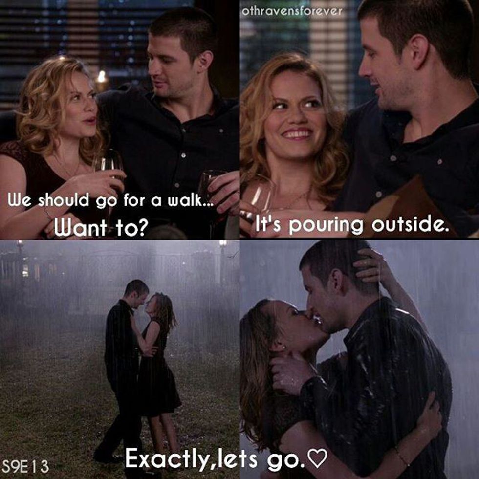 14. Nathan: "We should go for a walk. You want to?" Haley: "It’s pouring outside." Nathan: "Exactly. Lets go."