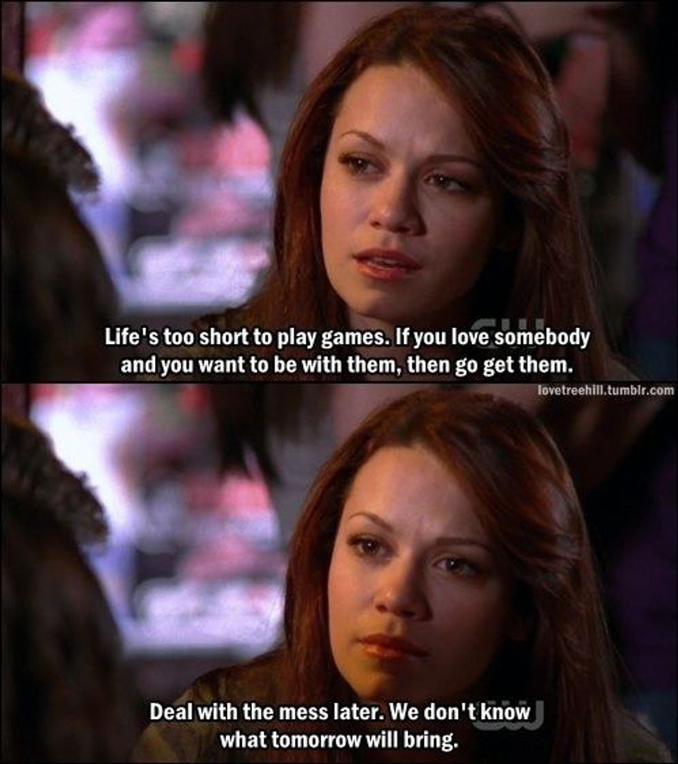 36. Haley: "Life is too short to play games. If you love someone and want to be with them, then go get them. Deal with the mess later. You don’t know what tomorrow will bring."