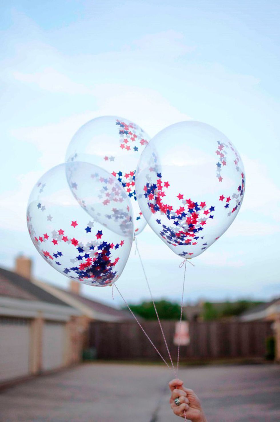 6. Here is a easy way to spice up your balloons for this years party. Before blowing them up, just add a few pieces of confetti and your balloons with be as patriotic as you are!