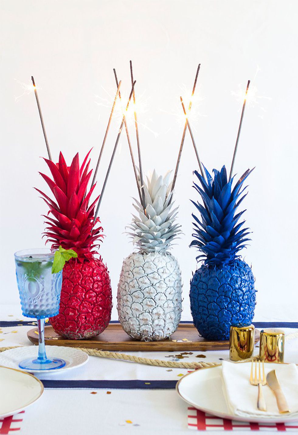 8. This is the cutest centerpiece ever! Just purchase three pineapples and spray paint them with red, blue, and silver spray paint. After doing that insert some sparklers and light them when the time is right!