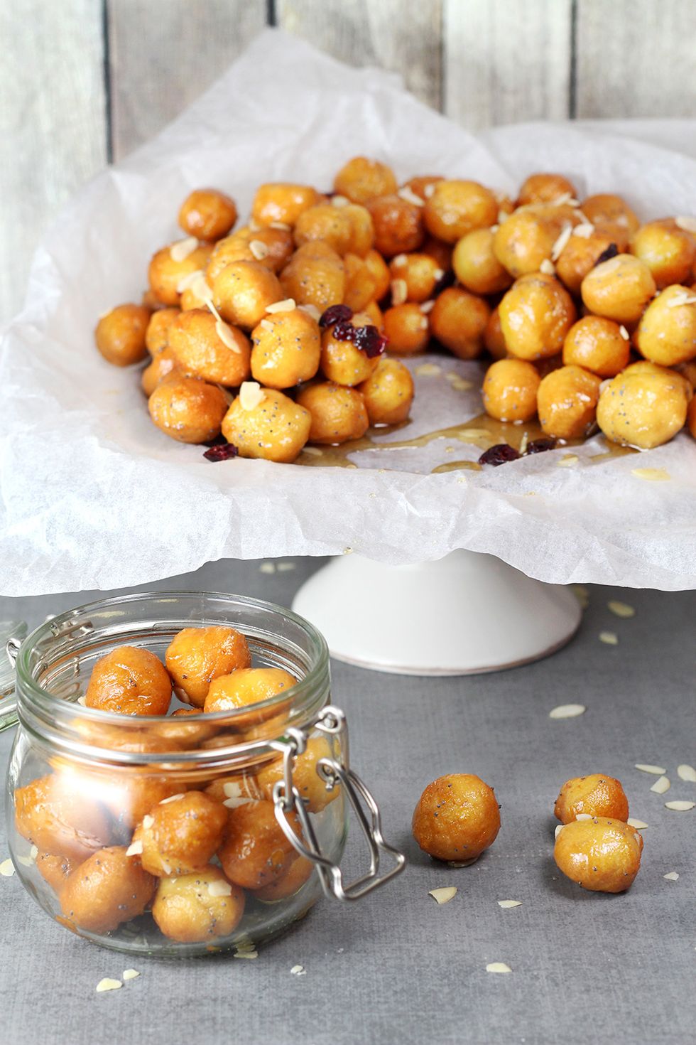 Cut the dough into 4 equal-sized pieces. Lightly flour a cutting board or surface, roll out each piece of dough until it's approximately 1/4 inch thick. Cut each piece of dough into 1/2-inch-wide strips; cut each strip of pastry into 1/2-inch pieces and continue to roll each piece of dough until it resembles a hazelnut. Next, fill a large heavy-bottomed saucepan with vegetable oil a third of the way and heat over medium heat until a deep-frying thermometer inserted in the oil reaches 375°. (If you don't have a thermometer, testing using a sliver of bread will brown in about 3 minutes.) Finally, carefully drop the dough balls into the oil and leave them until a light, golden color appears (about 2 to 3 minutes). Transfer to a paper-towel-lined plate to drain. (Repeat)