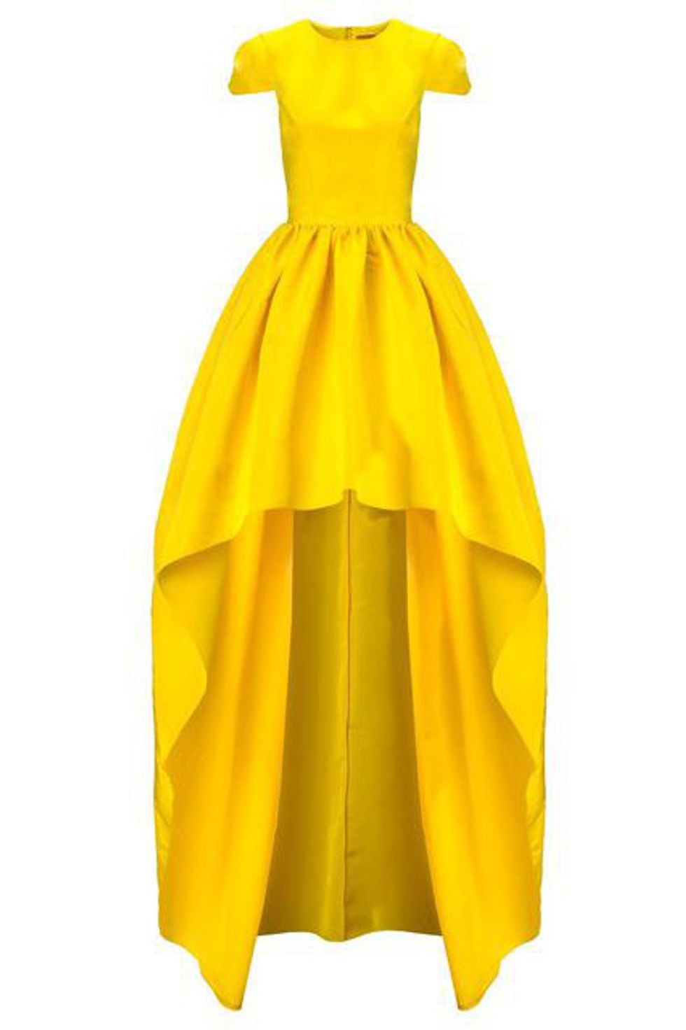 This bold, canary yellow gown is meant to turn heads with its bright color and fun design. Between the bright yellow that will easily draw eyes from across the room, to the crew neck and short sleeve cuts of the bodice, this dress makes a statement. Plus, the high-low hemline allows for shoes to be seen, so wearing your best pair is a given. This dress is perfect for those who like to take fashion risks and stand out from the crowd.