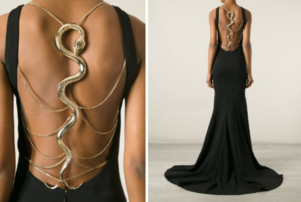 If only this dress came in green! This almost too perfect dress is ideal with its statement back piece. The golden chains and snake adorn the wearer's back in a dramatic way to set them apart from everyone else in the room. The simplicity of the design allows for the snake to stand out against the dress without it feeling overpowered. With its figure-hugging silhouette, this dress is not only unique, but also sexy.
