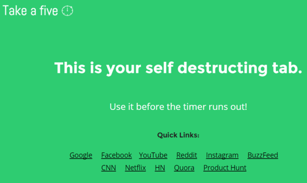 If your problem goes beyond Smartphones and you often find yourself wasting time on the computer as well, Take a Five is here for you. They understand that sometimes, everyone needs a little internet binge. Take a Five allows you to set a timer for how long you want to "goof off" on distracting sites, and will 'self-destruct' the browser once the time is up. Don't worry, there will be no physical combustion. However, if you're that addicted, maybe exploding your computer isn't the worst idea in the world.