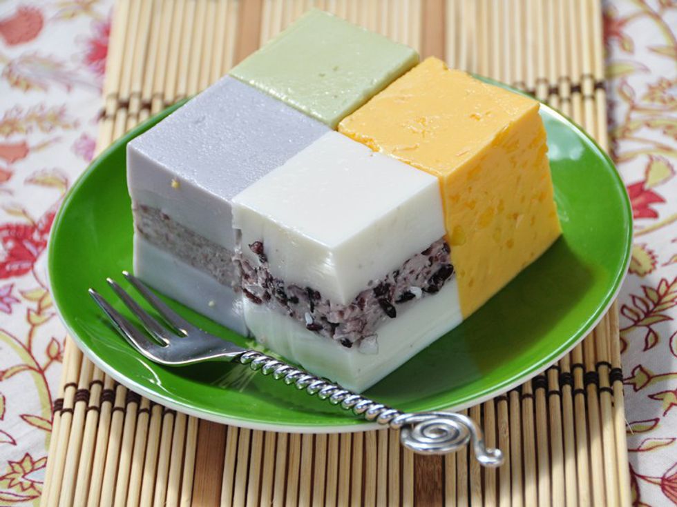 Sweet, easy to eat, and available in a variety of flavors, custard desserts are a real treat. My personal favorite is the coconut milk and black sticky rice custard (the white-colored one). They also come in flavors like green tea, mango, and taro!