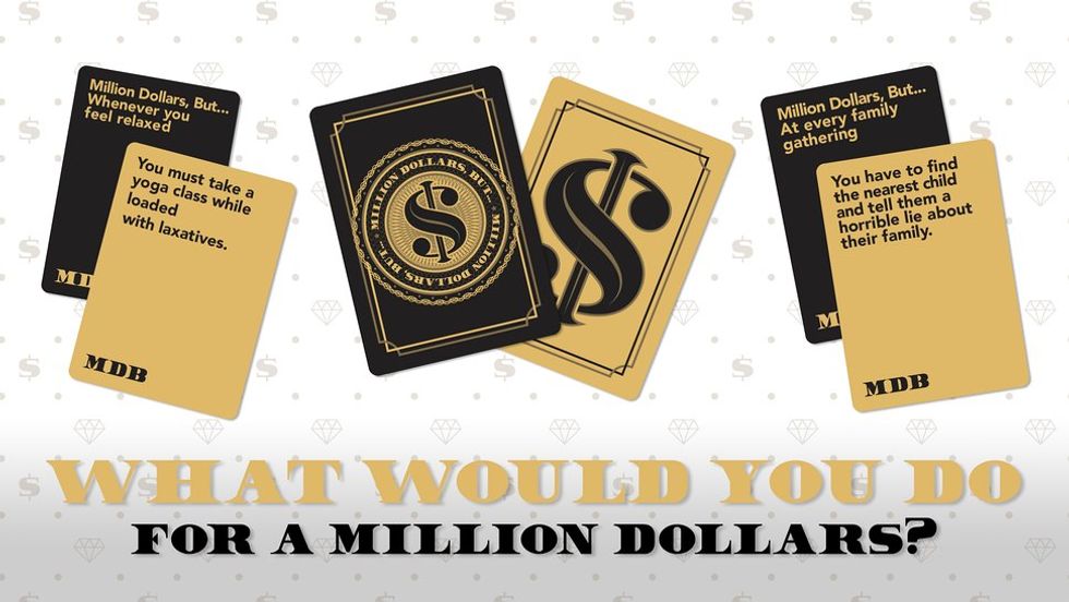 The concept is simple. You get a million dollars, but you MUST do whatever the other players say. As a sort-of adaptation of “would you rather,” the players submit scenarios to the judge, who then has to choose the one scenario they would NOT do for a million dollars. It’s hilarious and really helps you to see the best in every situation. To learn more about Million Dollars, But… The Game, click here .