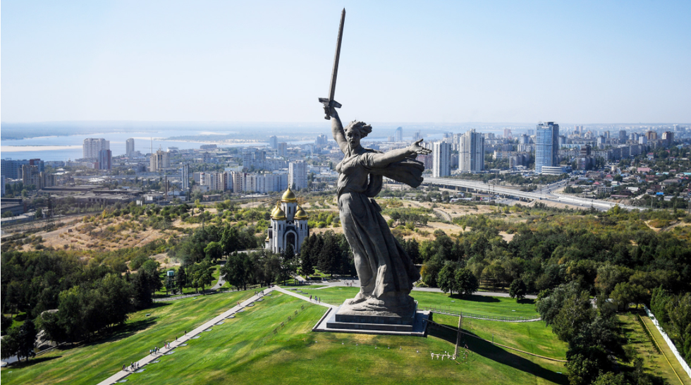 Our second monument is the largest statue in Europe, known as "The Motherland Calls". Located in the Russian city of Volgograd (formerly Stalingrad), the statue is one of three constructed to commemorate the Soviet soldiers who fought against the Nazis in World War II. The first statue is located in Magnitogorsk and depicts a worker forging a sword and handing it to a warrior; the second statue in the series is the Motherland Calls, which depicts a warrior woman symbolizing 'Mother Russia' raising the sword in battle; the third statue is in Berlin, depicting a warrior laying down the sword after winning the war.