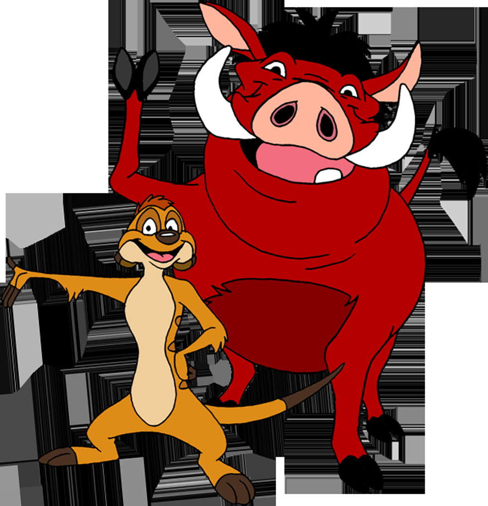 Timon and Pumbaa weren't your average friends. They were actually the least two you would expect to become friends, and you would expect them even less to befriend a lion, but they did. They found Simba as a baby and taught him to grow up and to live. This dynamic duo left their families behind because they weren't happy and decided to become happy. They taught us to be friends with everyone, even in those you wouldn't expect. They taught us about Hakuna Matata and how to live worry free. Sometimes you just need to let everything go and enjoy life.