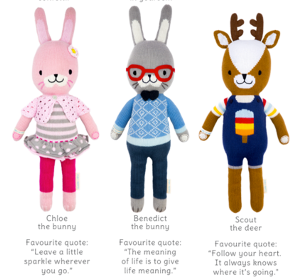 If the child in your life is a bit too old for the products on Baby Teresa, they would probably love one of these hand-knitted dolls from Cuddle + Knd. Each doll is made from natural cotton, costs about $55 and is used to provide meals to 10 children in need. The different doll options include mermaids, deer, bunnies, cats and a penguin.