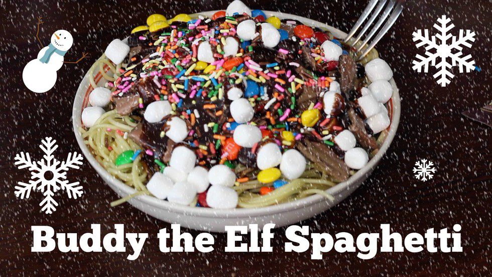 Elves have only four food groups: candy, candy canes, candy corn and syrup. His spaghetti concoction is iconic. Take some spaghetti and mix in the syrup. Top it off with chocolate pop tarts and any other candy you can scrape together. The sweeter the better!
