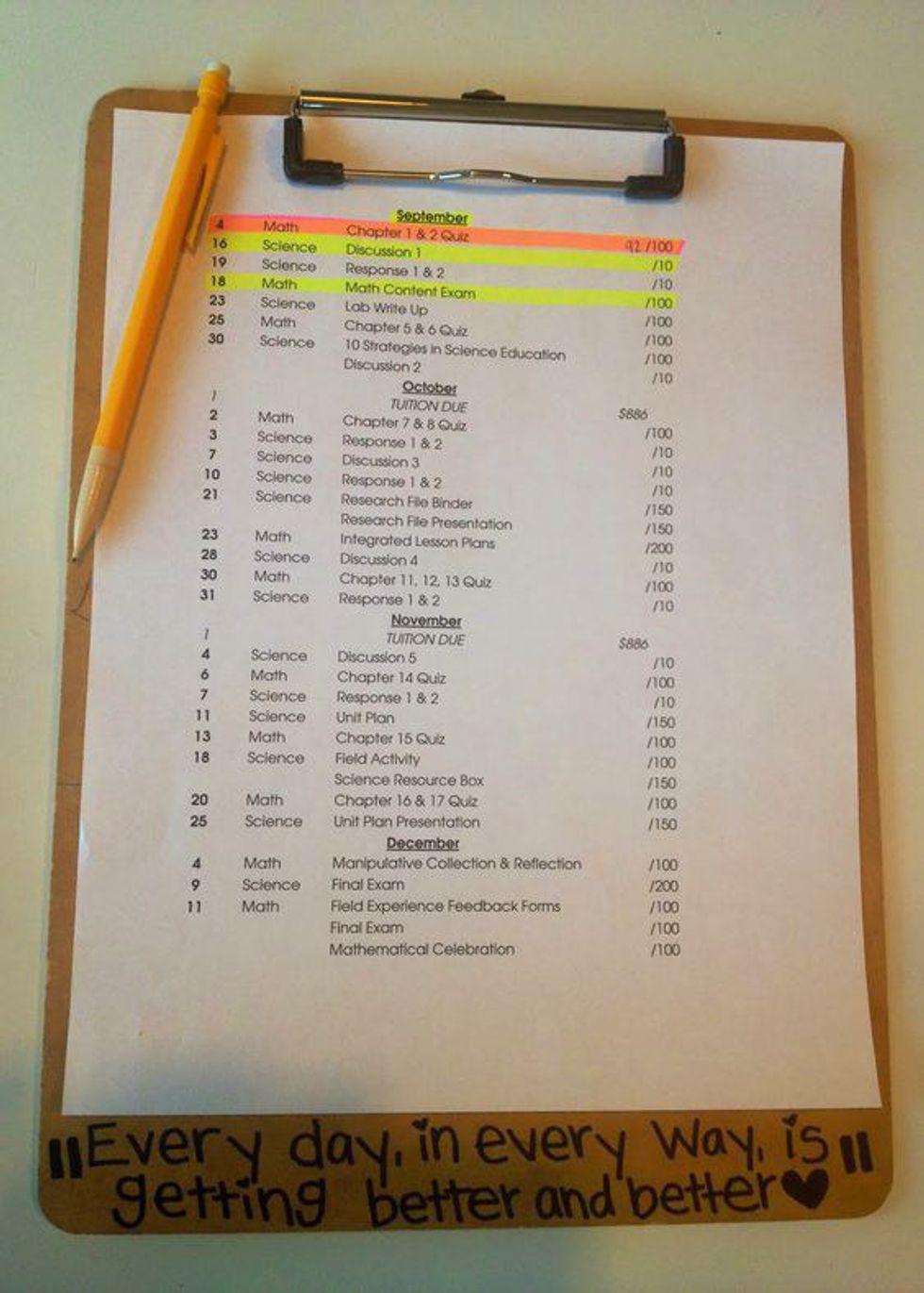 Reading this post on Pinterest and taking my transition class has shown me that this actually works. Putting all of your syllabi's together into one big packet, will help you avoid missing any assignments. This packet will be your go-to packet when you forget what may be due that week or the assignments to come. Be sure to remember to cross off any assignments that are done and make sure you keep it updated if any dates are changed. This packet should include, dates, classes, assignments, quizzes, test, midterms, and finals.