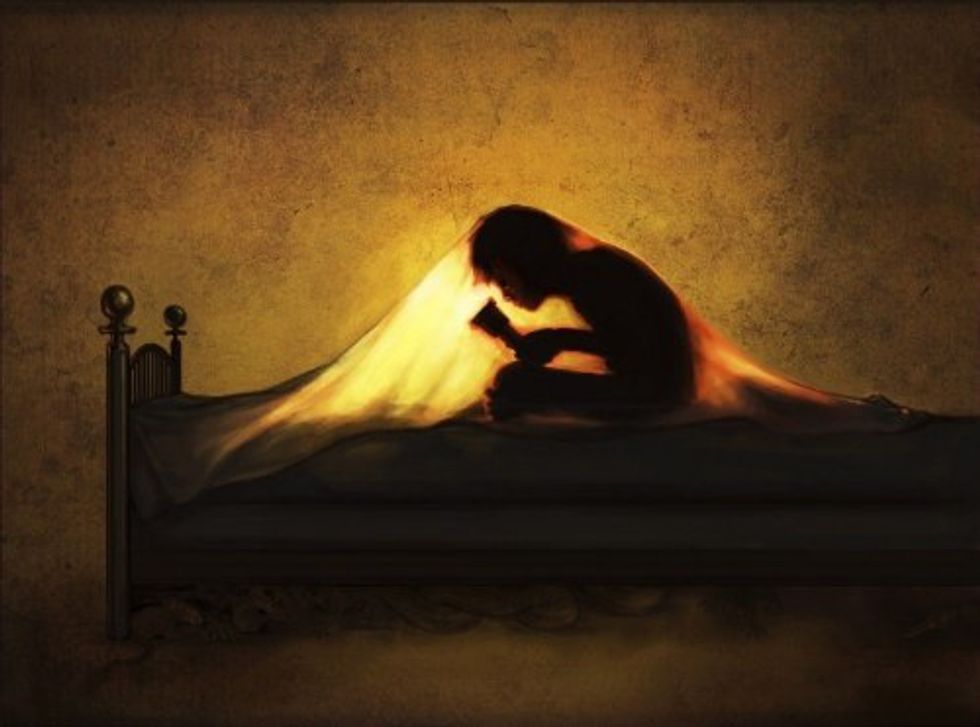 I can't depict this as something that never happens in real life because I did it once, and instantly felt dumb. This happens very often in movies and television but after my experience I couldn't understand why. Why not just read with the lights on laying in bed? What are your parents going to do? Yelling at you for reading, seems pretty counter-intuitive if you ask me. I feel like parents would be happy to find their child reading. Besides it's complicated to hold the flashlight in one hand while holding the book in the other because you have to put the flashlight down everytime you have to turn the page. So next time kids don't go under the covers to read, just read normally your parents won't care one bit.