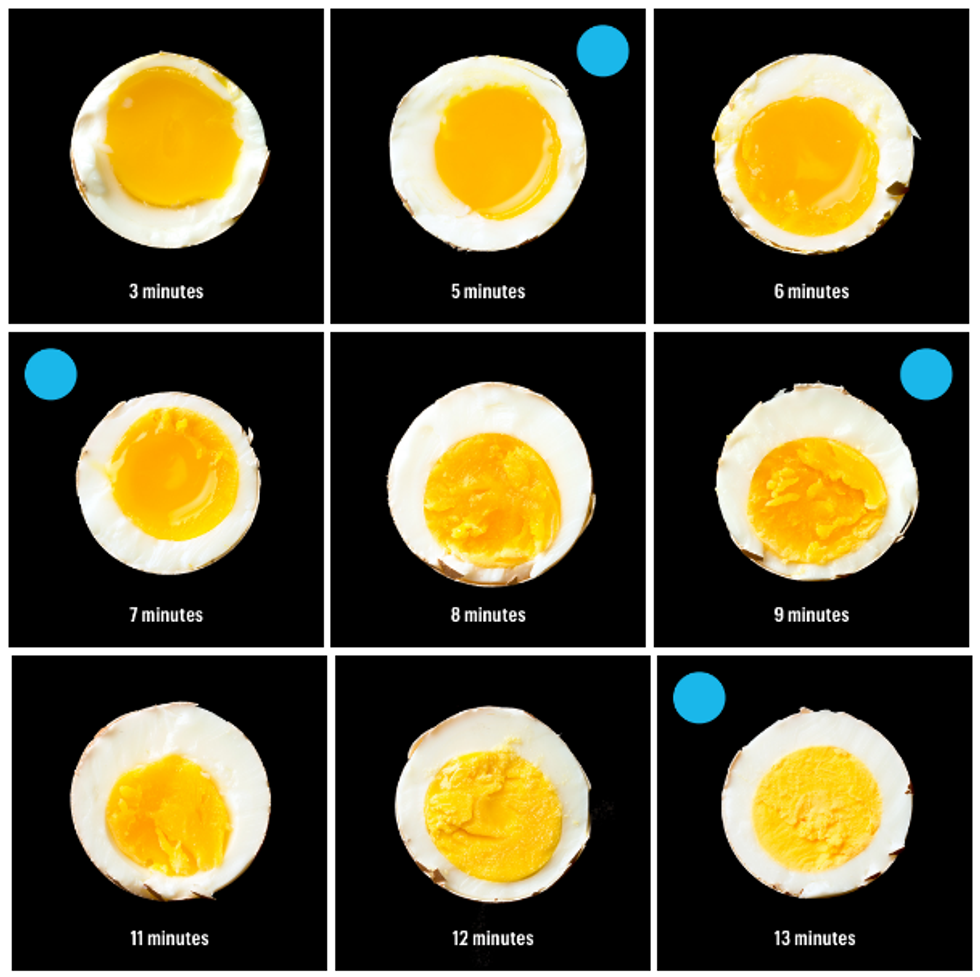 Boiled eggs are perfect for a quick breakfast, plus there are many recipes that call for them! There are two ways to boil eggs. The first is to put uncooked eggs in a pan of cold water and bring them to a boil. The second is to bring the water to a boil and gently drop the uncooked eggs into the pan. If you use the second method, you can time the eggs according to the above picture. If you use the first method, you can time the eggs once they come to a boil.