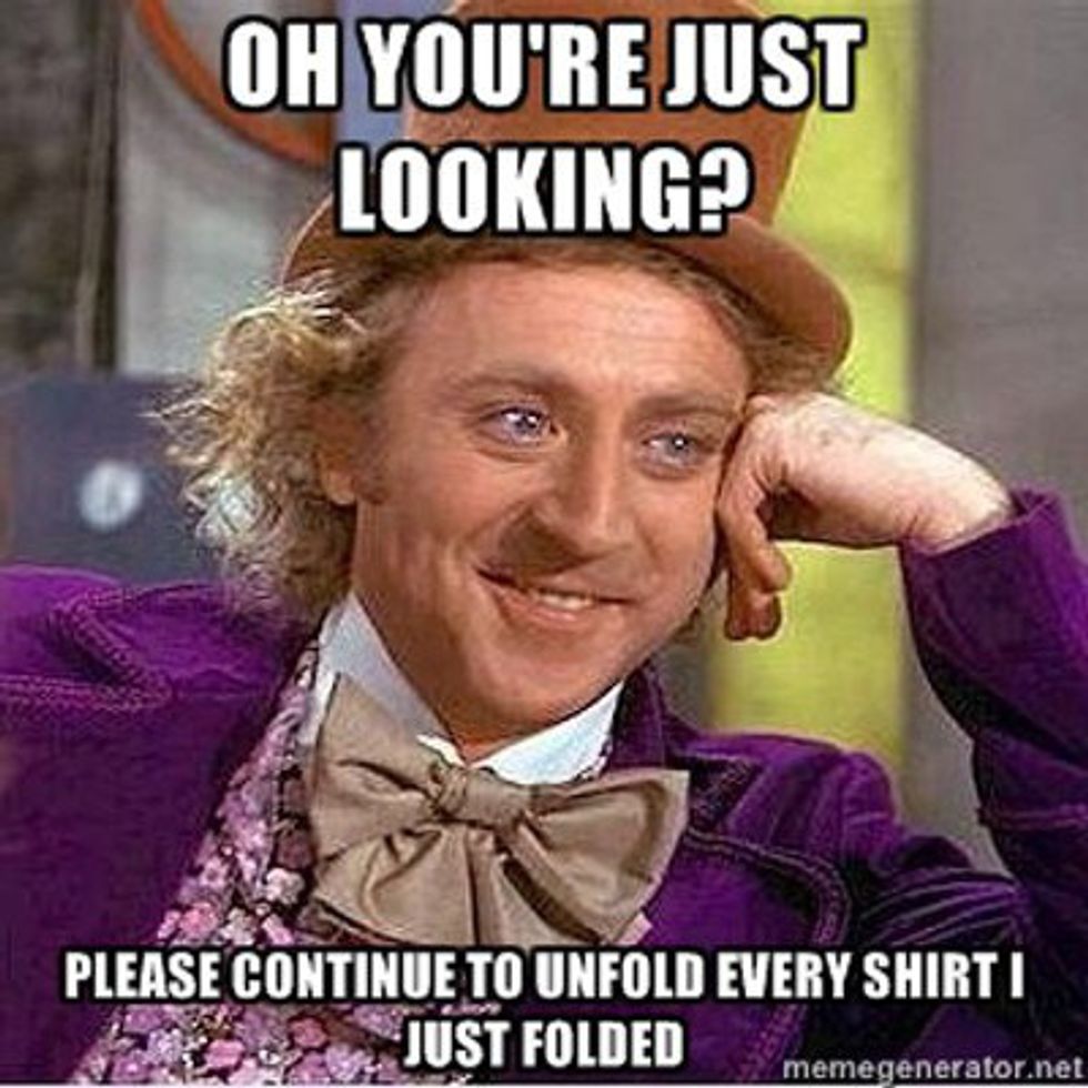 You know all those stacks of shirts that are crisp and nicely folded? Yeah well that folding takes time, it doesn't happen at the snap of my fingers. You saw me finish folding them into the pretty stack, you saw all my effort. Wait scratch that, you waited for me to finish folding them before decided you wanted to the see the bottom shirt. It's not like the top shirt is any different, but I guess it's my job to constantly refold the same shirt 20 million times.