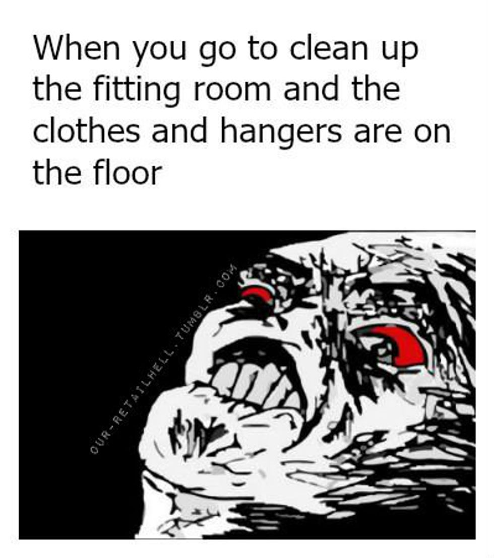 Trying on things can be messy, I get it, I'm also a shopper, but I shouldn't cringe while cleaning a fitting room. If you leave hangers every where and clothes inside out there's a 95% chance you're on the top of my I hate you list. Cleaning up after messy, inconsiderate people is not in my job description.