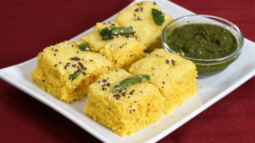Dhokla originates from the Indian state of Gujarat. It is made of a mix of rice and chickpeas which are soaked overnight and then ground, fermented, and garnished with various spices. Often served with green mint chutney or a sweet-tasting chutney made from dates, dhokla can serve as a delicious snack, meal, or on-the-go treat!2. Thali