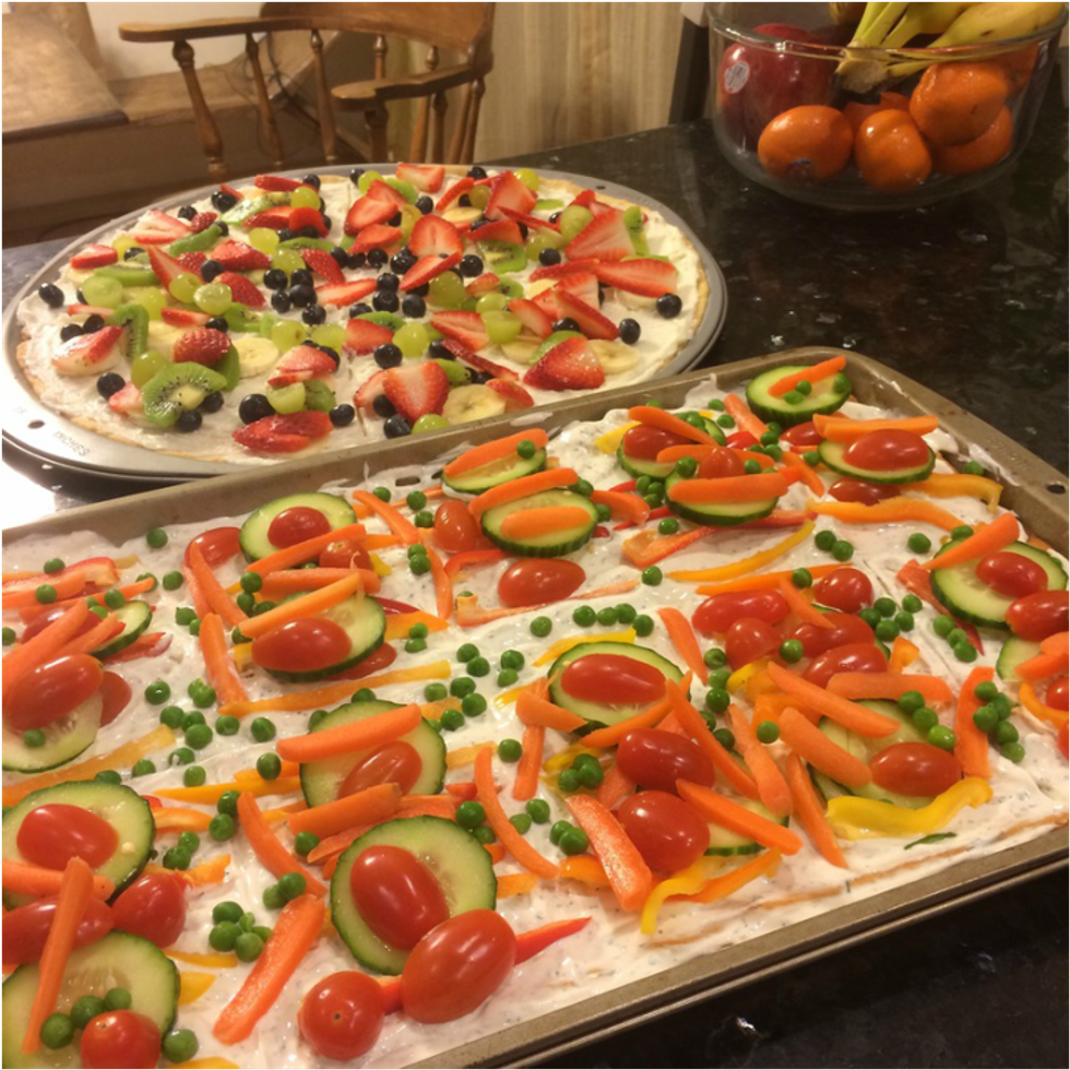 These are so incredibly easy to make and so healthy! You can literally put anything you want on it and make it original. These are such a hit at parties that I promise people will ask you for more! Click to see a basic recipe for veggie pizza and fruit pizza.