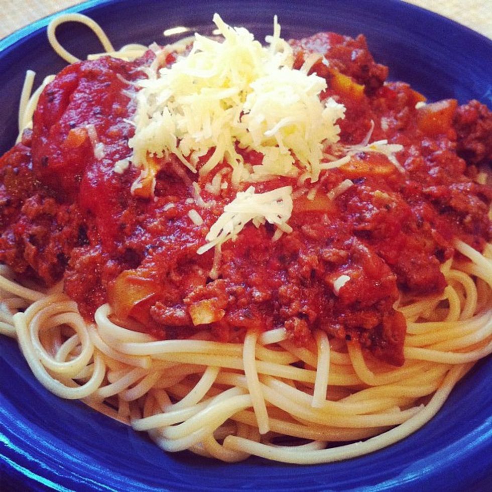 Spaghetti is one of the quickest and simplest dishes to make during the week. Throw on a pot of water, cook some noodles and throw on some pasta sauce. Most pasta sauces can be bought pre-made if you aren't too worried about spices. This makes even less steps as you dump and heat up to create a simple meal. Spaghetti is easily paired with microwavable veggies or a quick oven baked garlic bread.