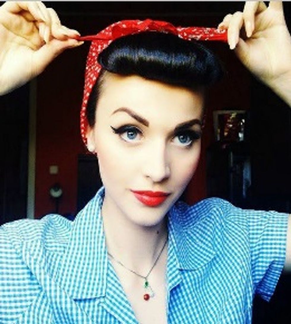 We can do it! A blue or jean button up and a red bandanna is all you need to be a retro rockabilly rebel! Create a small puff or twist on the front/top of your hair and pin it. Wrap the bandana around and create a small knot. Roll up the sleeves, add a pop of color with some bright red lipstick, and darken your eyebrows for this classic 1940’s look!
