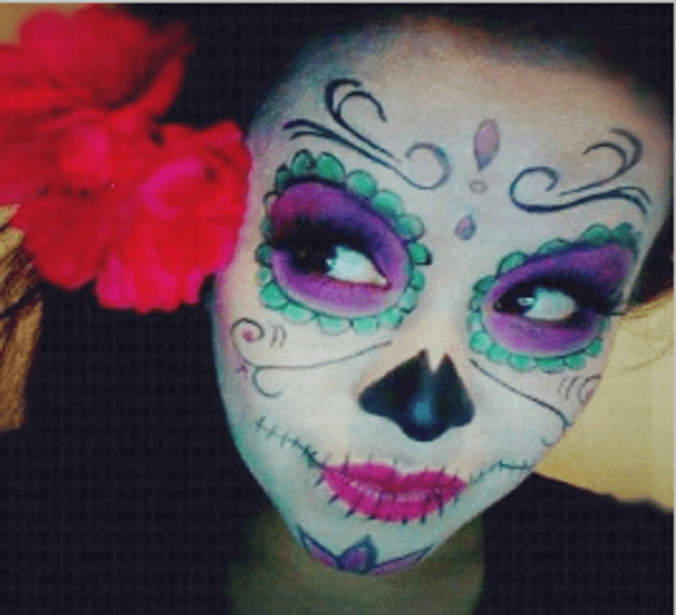 You don’t necessarily have to be picasso to transform into a colorful calavera. You can cover your whole face, half of your face, or just one part depending on how last minute it is. Over a white base, just create circles around your eyes, fill them with colors and then outline them with flower petals. Then, color your nose and create a skeleton-like mouth. You can even wear any dress of your choice!