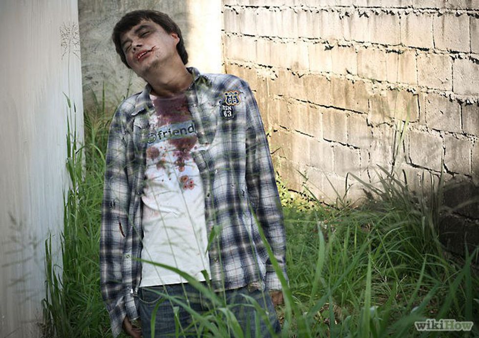 Makeup: All you really need is some grey makeup, some black or brown eye shadow. Paint your face or body grey and use the brown and black to contour the planes of your face or body to make yourself look gaunt, tired, old, and dead-ish. Add some fake blood or smudge lipstick around your mouth to look like blood and if you really want to get creative, make your own or buy zombie bite prosthetics.