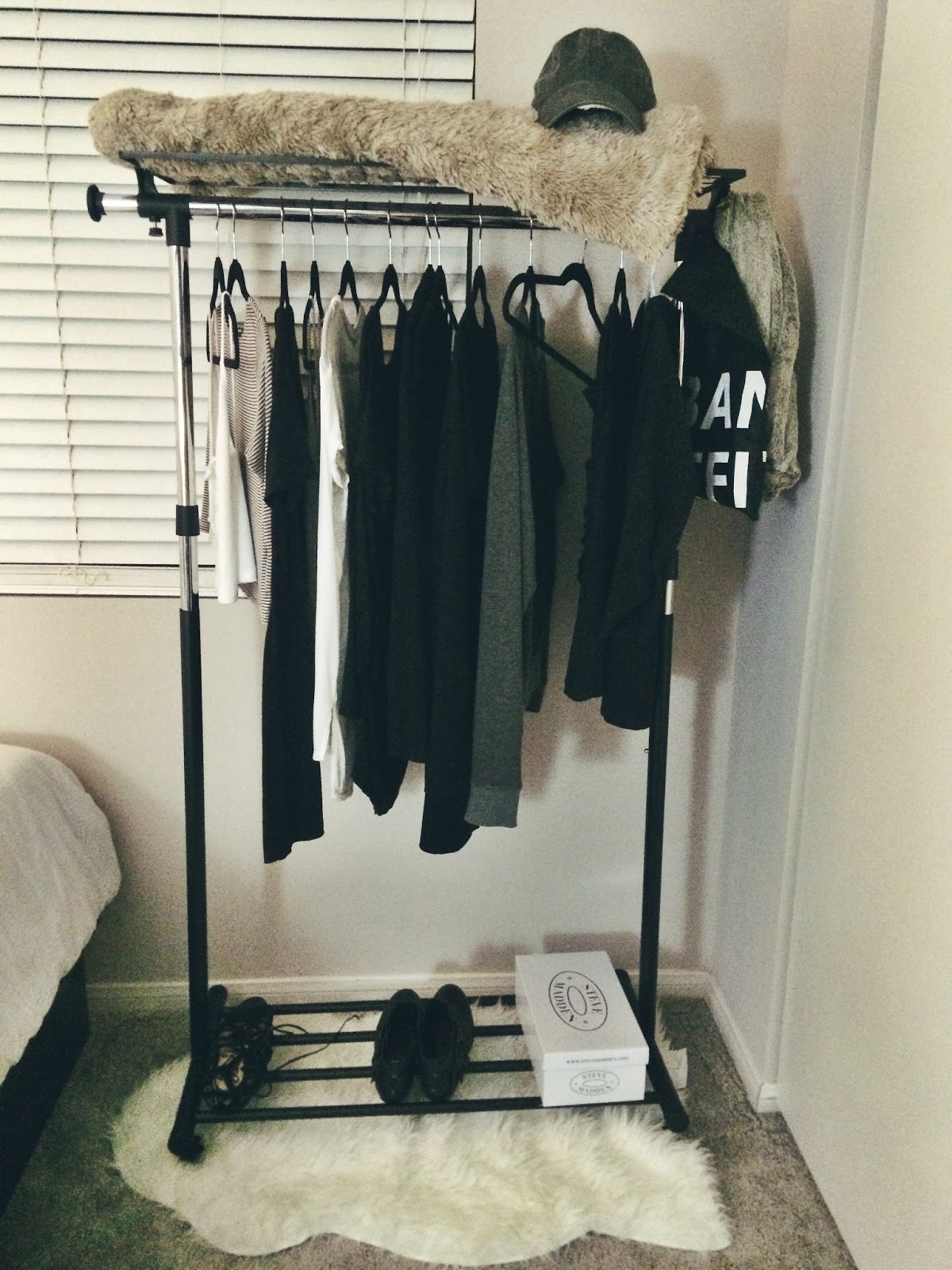 I love the look of a clothing rack when it's used as a decoration piece. To keep a simple theme to my room, I chose shades of black, white, and gray to hang on my rack. I also added a fluffy white rug to the bottom and a fluffy cream colored blanket to the top.