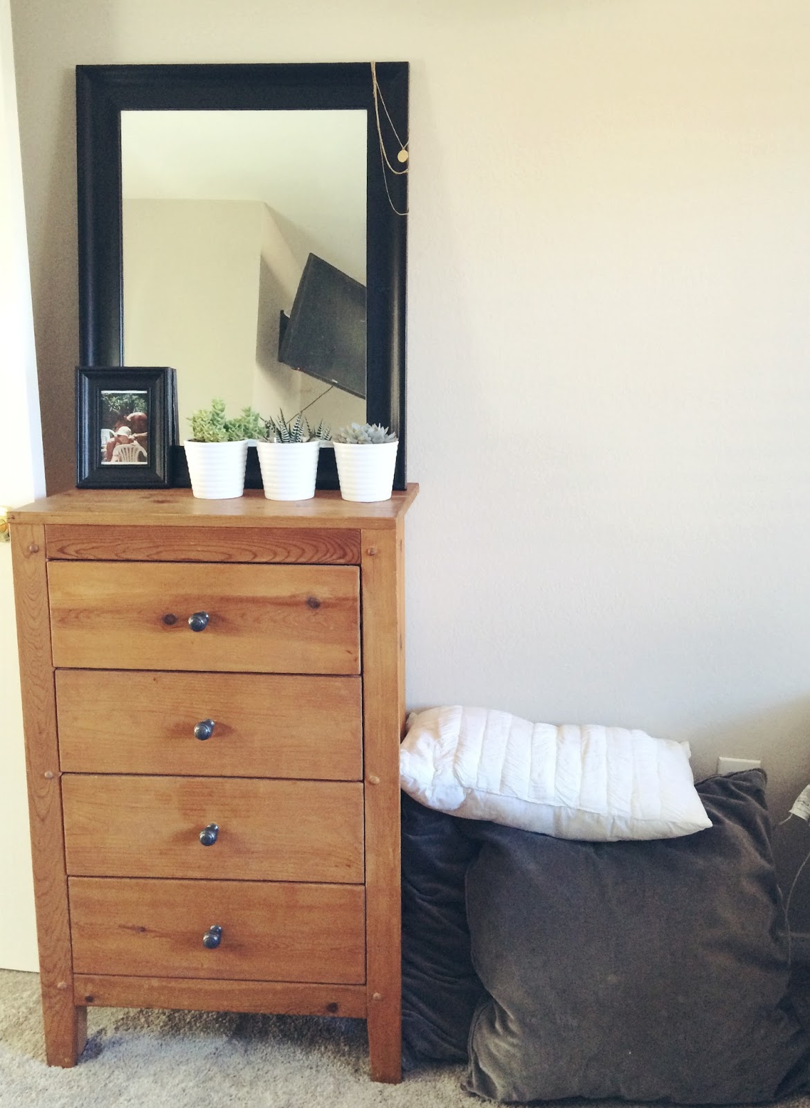 I love having plants in my room because they help to bring in some life and they add a pop of color. A great place to get fresh succulents is farmers markets. I put mine in these small white pots from IKEA to help tie in the white theme.