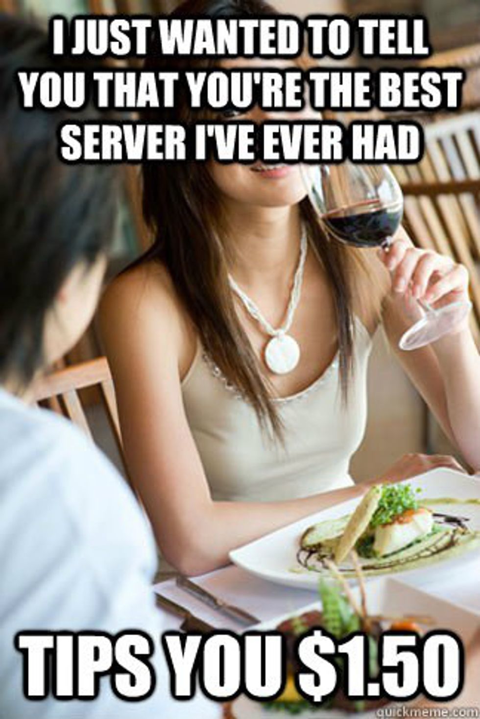 Tip your server around 5-1o percent even if they were amazing at their job. They make a whopping $2/hour wage, so really that tip is just extra. Sure, they work really hard to make sure you have everything you need, and you did choose to go to a restaurant where tipping is a thing, but that's really not your problem. You got your food, so why bother showing appreciation for good service?